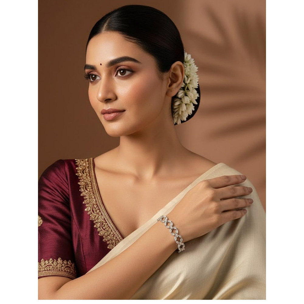 Description : Elevate Your Style with This Exquisite Silver-Toned Bracelet, Intricately Designed In A Leaf Motif and Adorned with Shimmering Marquise-Cut Cubic Zirconia Stones. Crafted From High-Quality Brass and Finished with A Luxurious Rhodium Plating, This Bracelet Adds A Touch Of Elegance To Any Ensemble. Whether You're Heading To A Wedding, Party, Or Formal Event, This Timeless Piece Will Enhance Your Look Effortlessly.