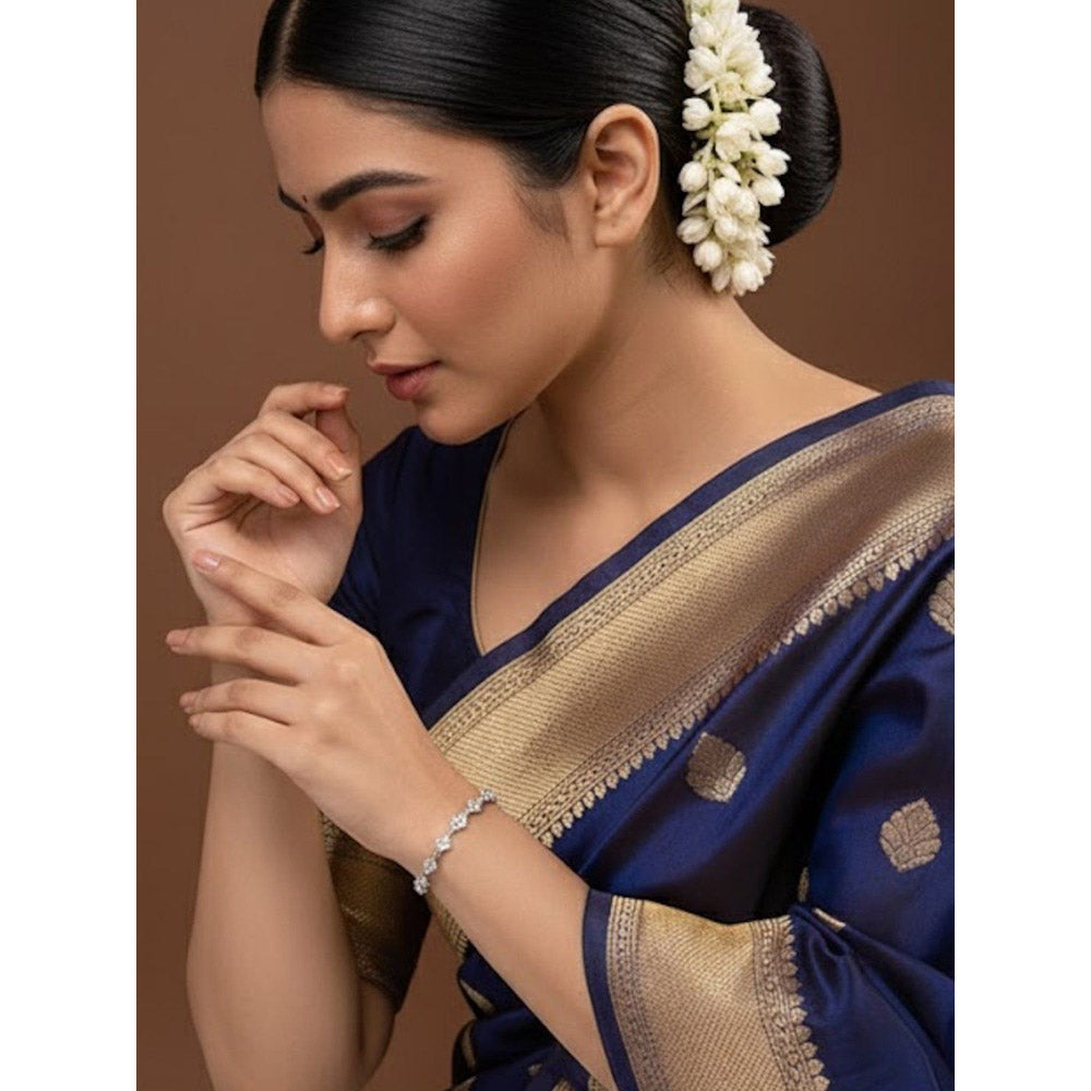 Description : Elegant Silver-Toned Bangle Bracelet Studded with Sparkling Cubic Zirconia Stones. This Delicate Silver-Plated Bangle Adds Subtle Elegance with Its Unique Arrangement Of Multi-Cut Cz Stones. Ideal For Everyday Glam Or Pairing with Light Festive Outfits, It Blends Minimalism with Brilliance Effortlessly.