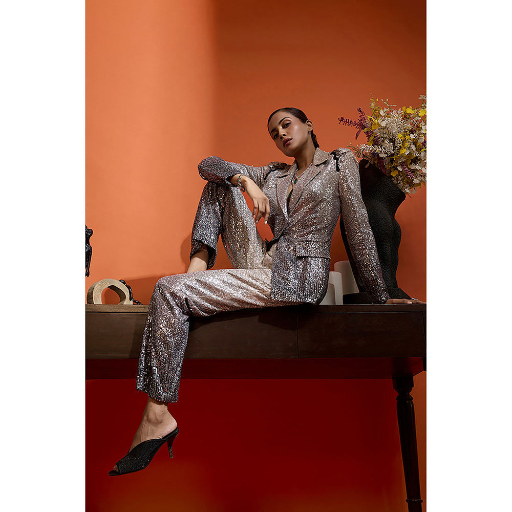 Description : This Shimmering Silver Ombre Co-Ord Set Exudes Modern Glam With Its Structured Silhouette And All-Over Sequin Detailing. The Tailored Blazer Features Intricate Black Applique Embellishments On The Shoulders, Adding A Subtle Contrast Paired With Relaxed Fit Trousers.