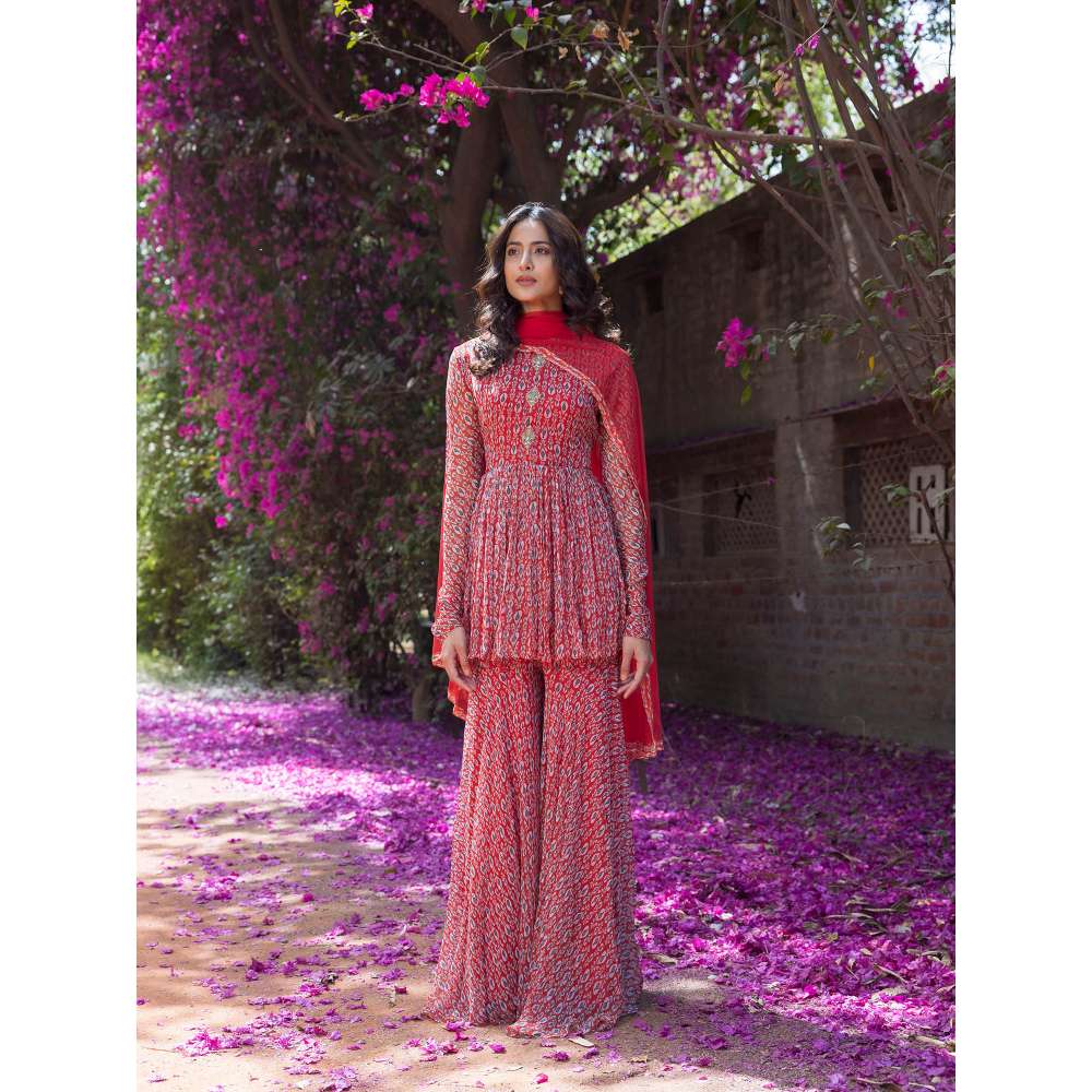 Description : Printed Sharara suit set with a Peplum cut top in red is an alluring piece. -The textile is georgette and perfect for summers. -Shirt features a front yoke decorated with hand embroidered circular patches and has full sleeves. -Sharara pants are flowy and breezy, and comes with a chiffon dupatta having a printed border. -Pair with statement jewellery to enhance the look. -Slight variation in color is possible due to digital photography. -Being an authentic brand we deliver the same styles as shown on the website.