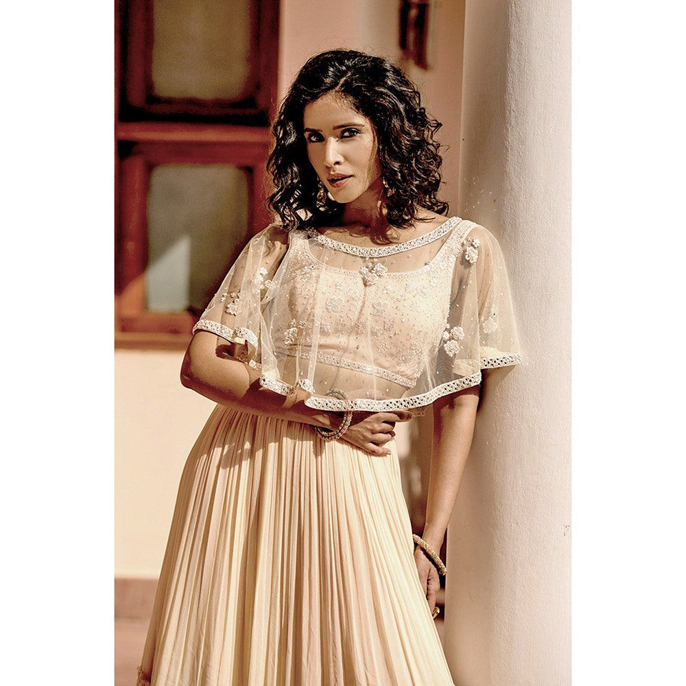 Description : Elevate your look with this beige embroidered cape with blouse & skirt set from Bbaawri. Crafted from georgette, this gorgeous set is finished with half sleeves and a round neck. Complete the look with a pair of heels and statement jewellery.