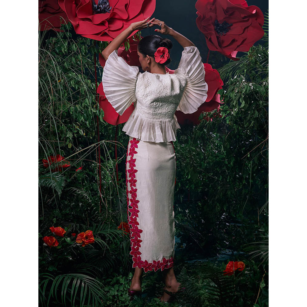 Description : Infuse fashion-forward elegance with this ivory top from CHANDRIMA. Made from high-quality fabric, this top features flared sleeves and a crew neck, with a floral pattern. Style it with a minimal jewellery and sandals to complete the ensemble.