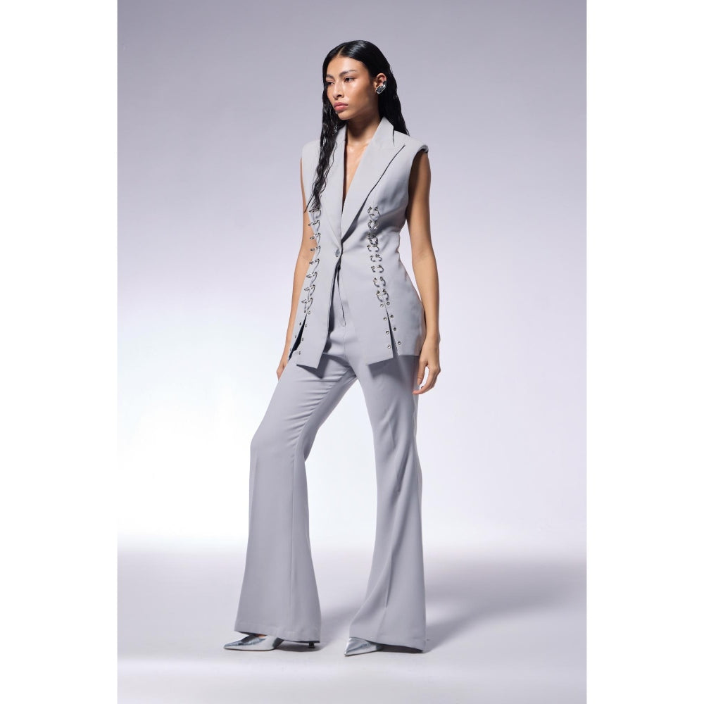 Description : Embrace This Ash Grey Suit, Featuring A Tailored Sleeveless Jacket Adorned with Striking Metal Septum Details Along The Sides, Paired with Wide-Bottom Trousers