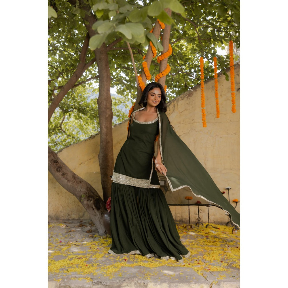 DEASHA INDIA Firdaus Mehendi Green Detailed Sharara with Short Kurta and Dupatta (Set of 3)