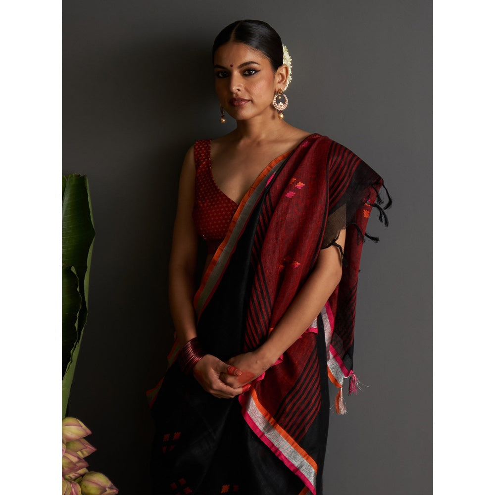 Five Point Five Black Motif Woven Overall Saree with Unstitched Blouse