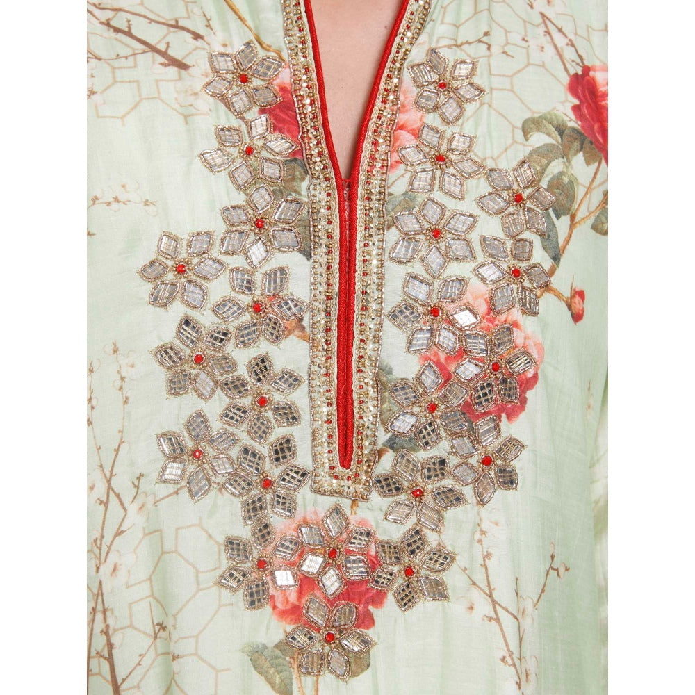 Description : This gorgeous Green printed kurta has rose floral prints and timeless gottapatti embroidary, it's an A line kaftan cut which sets it apart making it trendy and smart. can be paired with an off white palatzzo