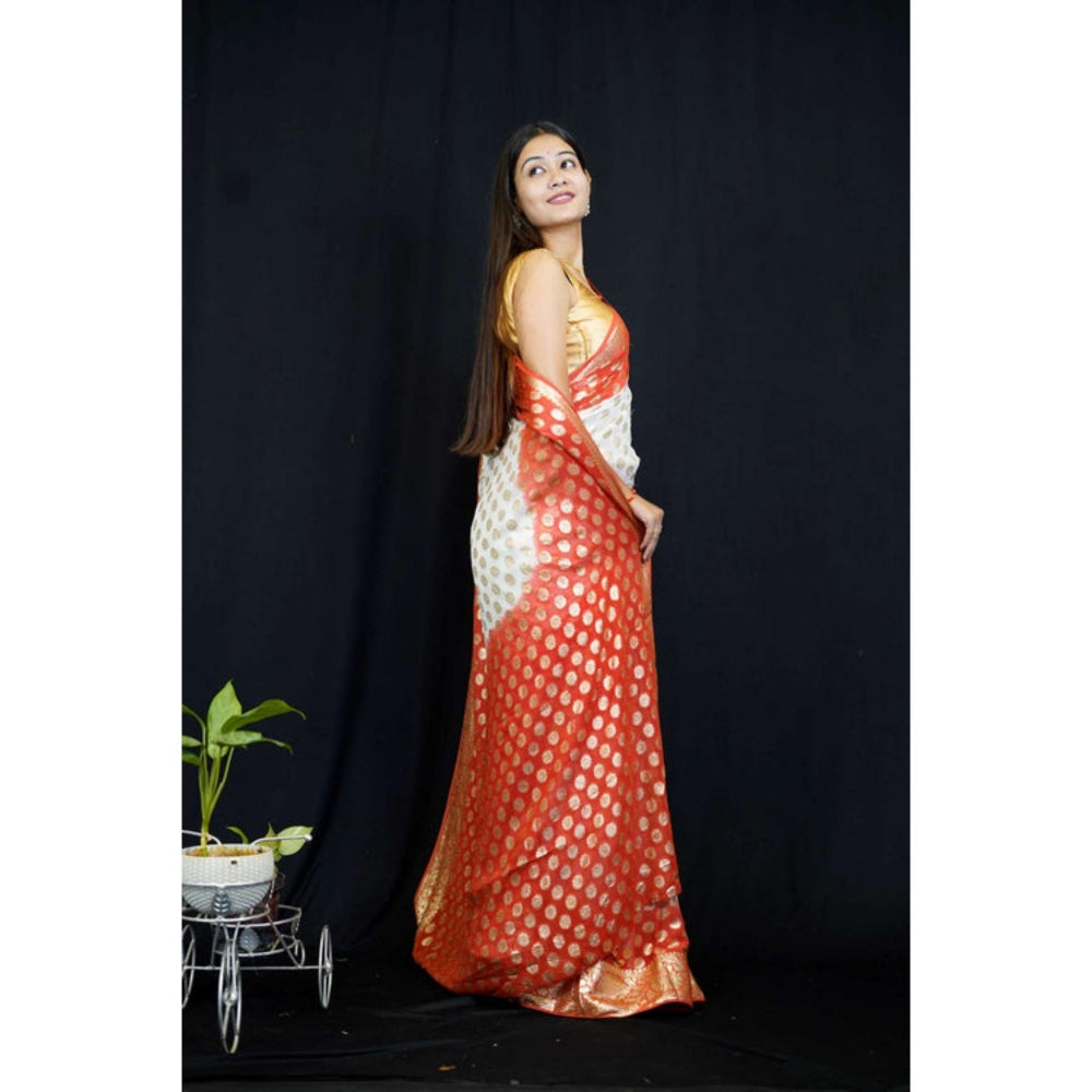 Isadora Life Womens Zari Printed White Pre-Draped Saree With Unstitched Blouse