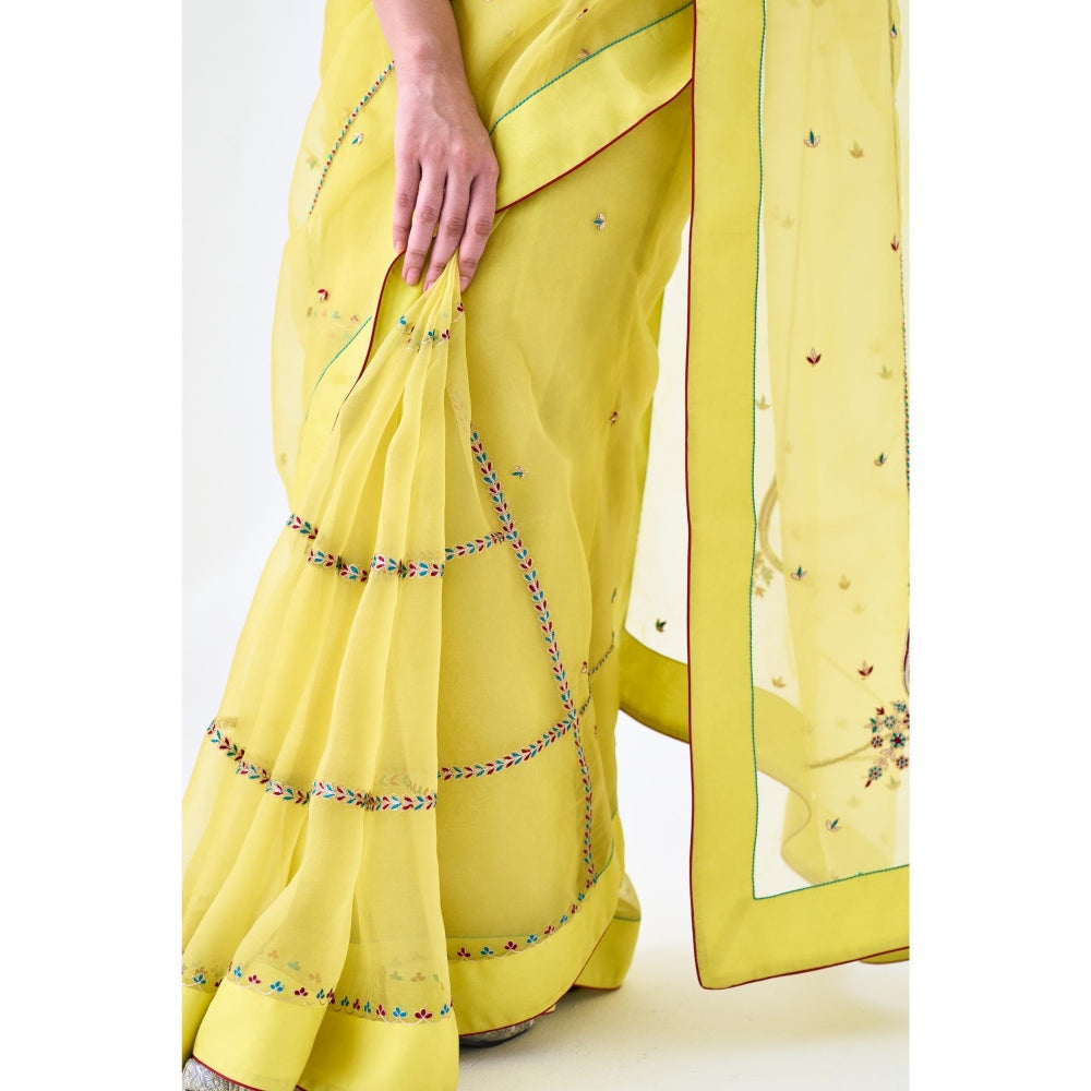 Description : Brighten Your Wardrobe with A Cheerful Yellow Organza Saree, Detailed with Intricate Embroidery Paired with A Natural Organic Cotton Petticoat. ( Blouse Is Not The Part Of This Saree, It Is Used Only for Photo Shoot Purpose )