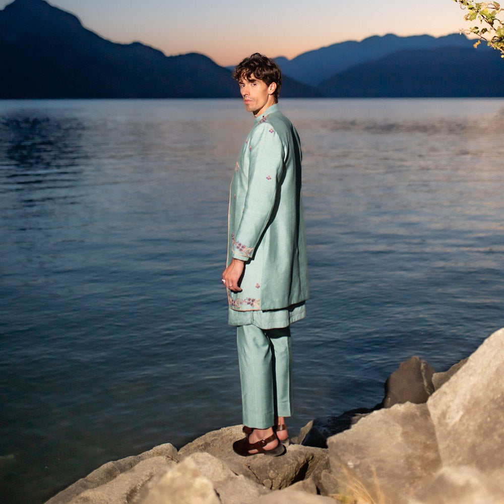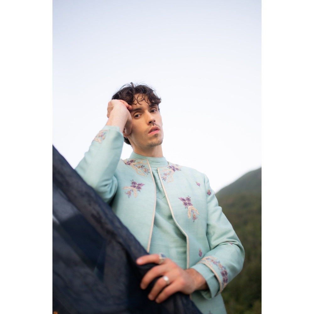 Description : Presenting Our Felicia Open Jacket Set In Duck Egg Color with Intricate Aari Work Details At The Borders and Front. Paired with A Tone-On-Tone Kurta and Trousers.