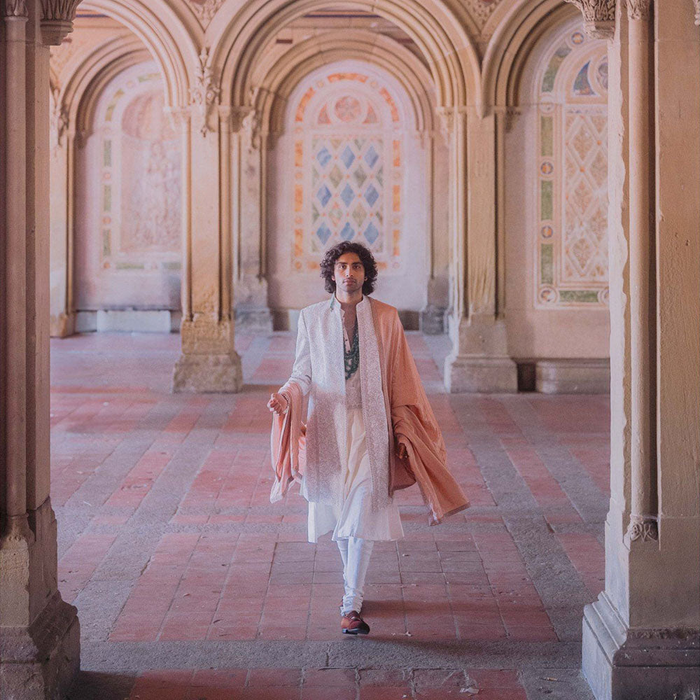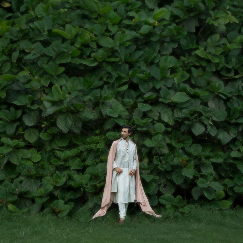 Description : Presenting Whisper Open Sherwani On A Linen Silk Base with Floral Pattern All Over, Embroidered Using Tone-On-Tone Dori Work and Kat Dana. Paired with An Anarkali Kurta, Churidar, Embroidered Double Border Kamar Bandh, An Old Rose Stole and Safa.