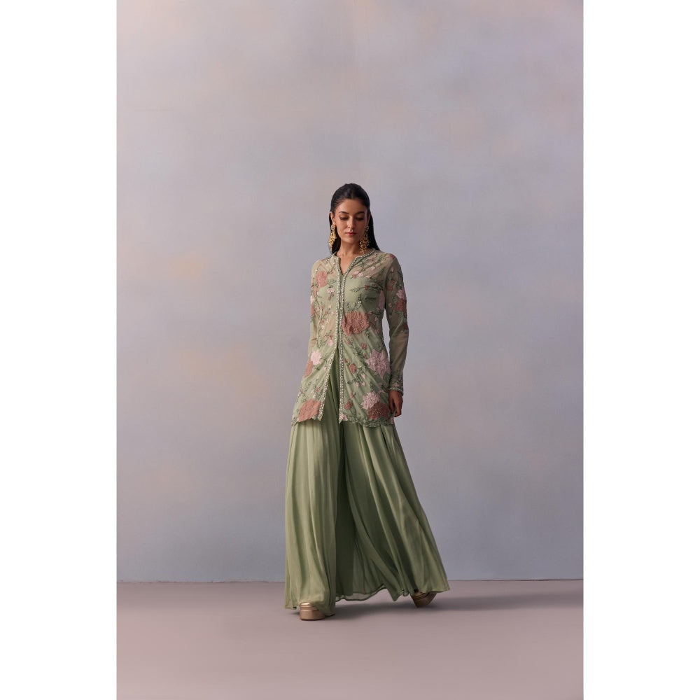 KALISTA Fidah Sea Green Embellished Bustier with Sharara and Jacket (Set of 3)