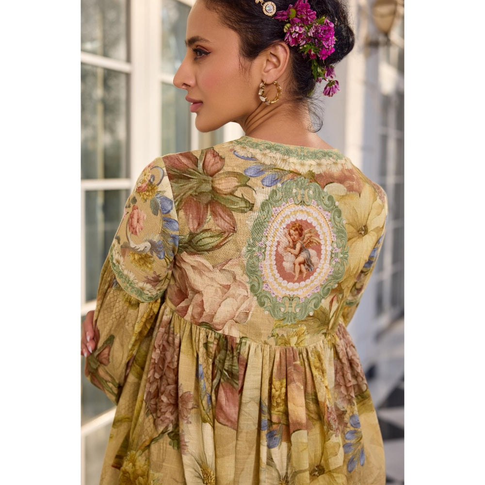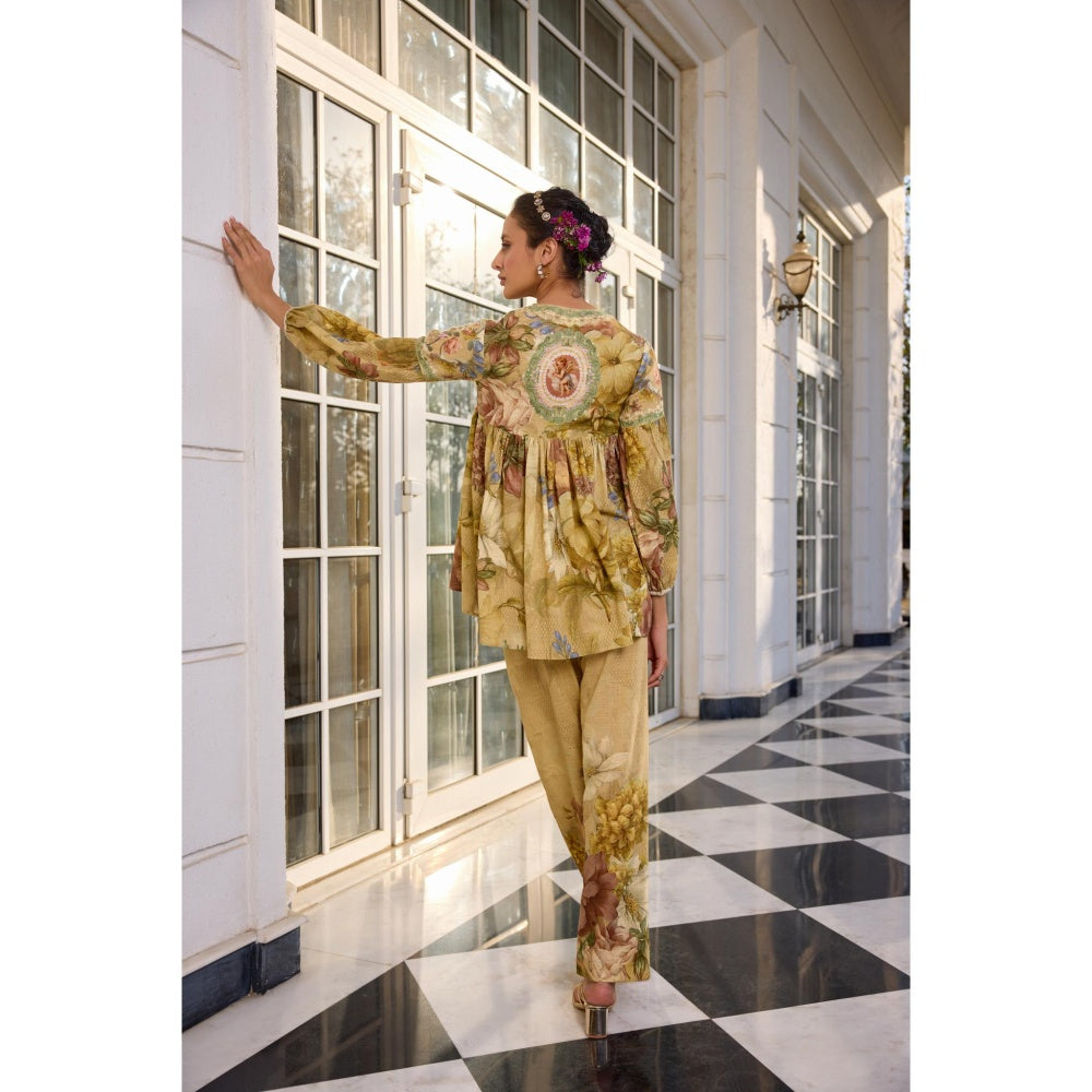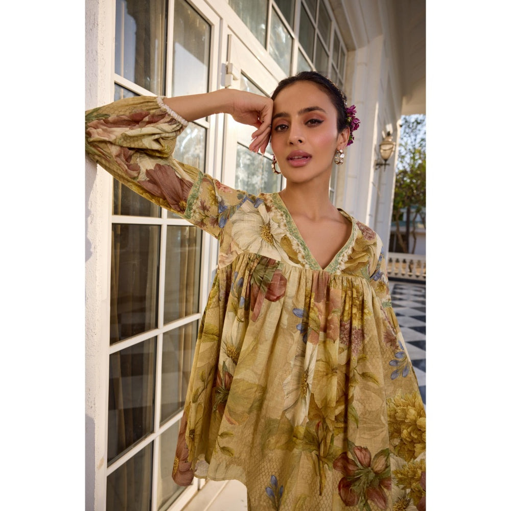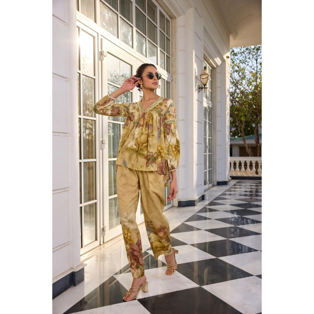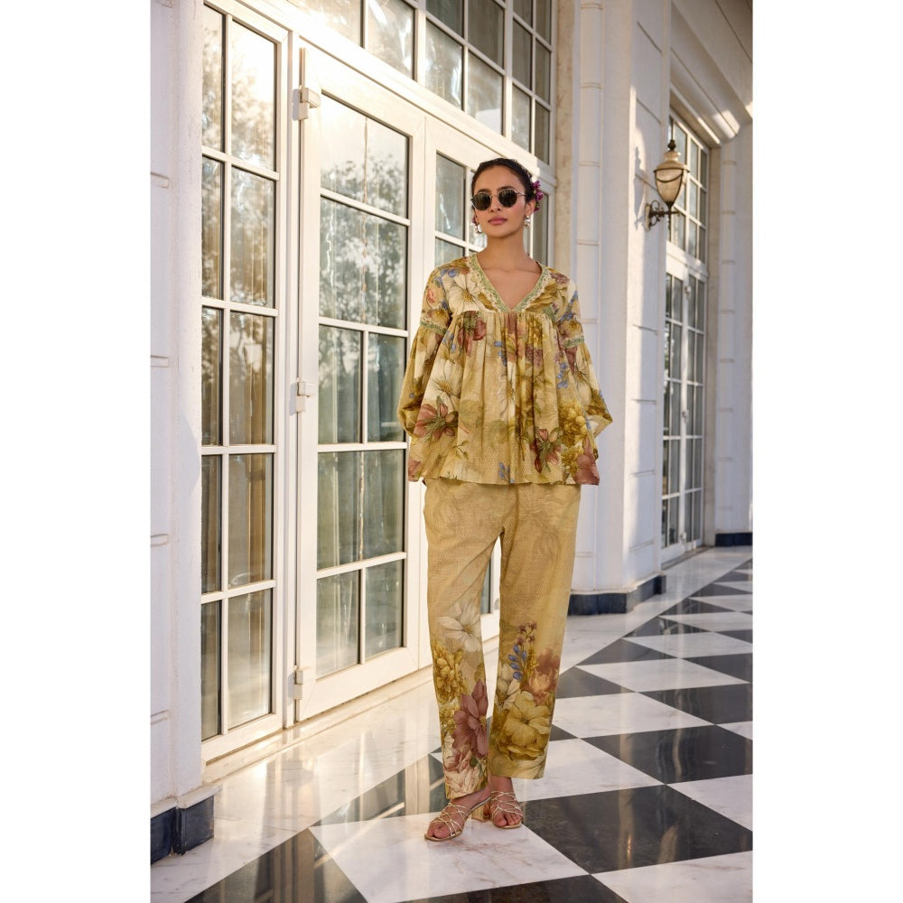 Description : Indulge In The Grace Of Anaisha Co-Ord Set, Boasting A Refined Floral Vintage Print In V- Shaped Neckline Pleated Top , Comes With Graceful Bishop Sleeves And Pants, Epitomizing Modern Sophistication With A Touch Of Classic Charm. Perfect For Your Summer Outings.