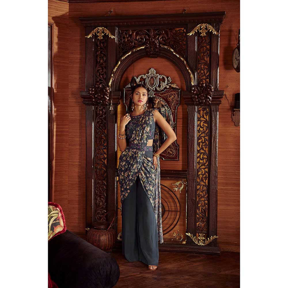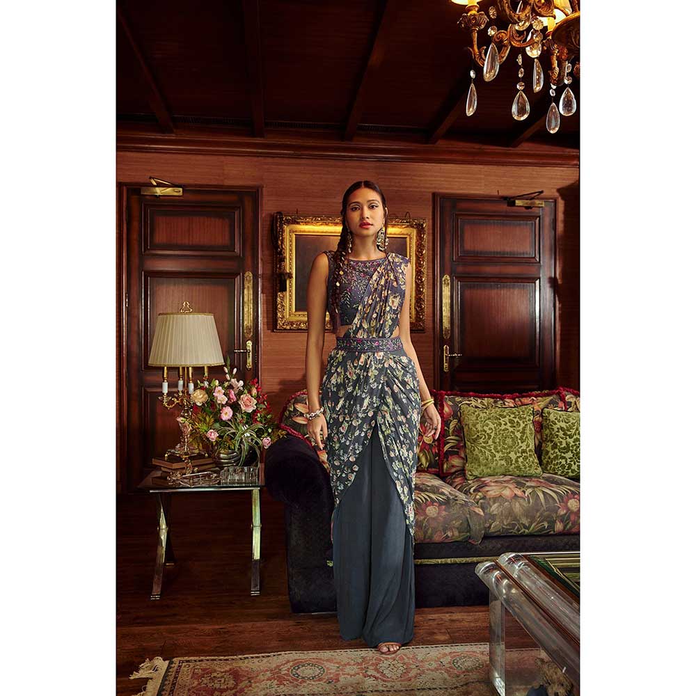 Description : FEATURING A PRE-DRAPED SAREE WITH ELABORATE FLORAL PRINTS, STYLED WITH A BLOUSE AND BELT INTRICATELY EMBELLISHED WITH BEADS AND SEQUINS. FABRIC: VISCOSE SILK COLOUR: BLUE NO. OF COMPONENTS: 3 BLOUSE LENGTH: 14.5" PANT LENGTH: 44"