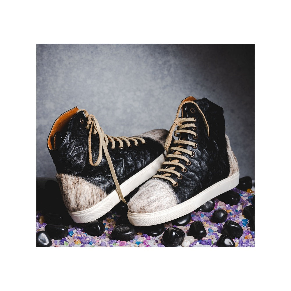Description : These high-top sneakers present Kavith's own design of winter boots with matte black crinkled leather held together by thick, leather laces in beige. The toe caps and the heel of the sneakers are orned with a contrasting off-white fur. With a curved topline, tan leather lining and white soles designed for comfort, this pair of sneakers is a brilliant fusion of textures and colours.