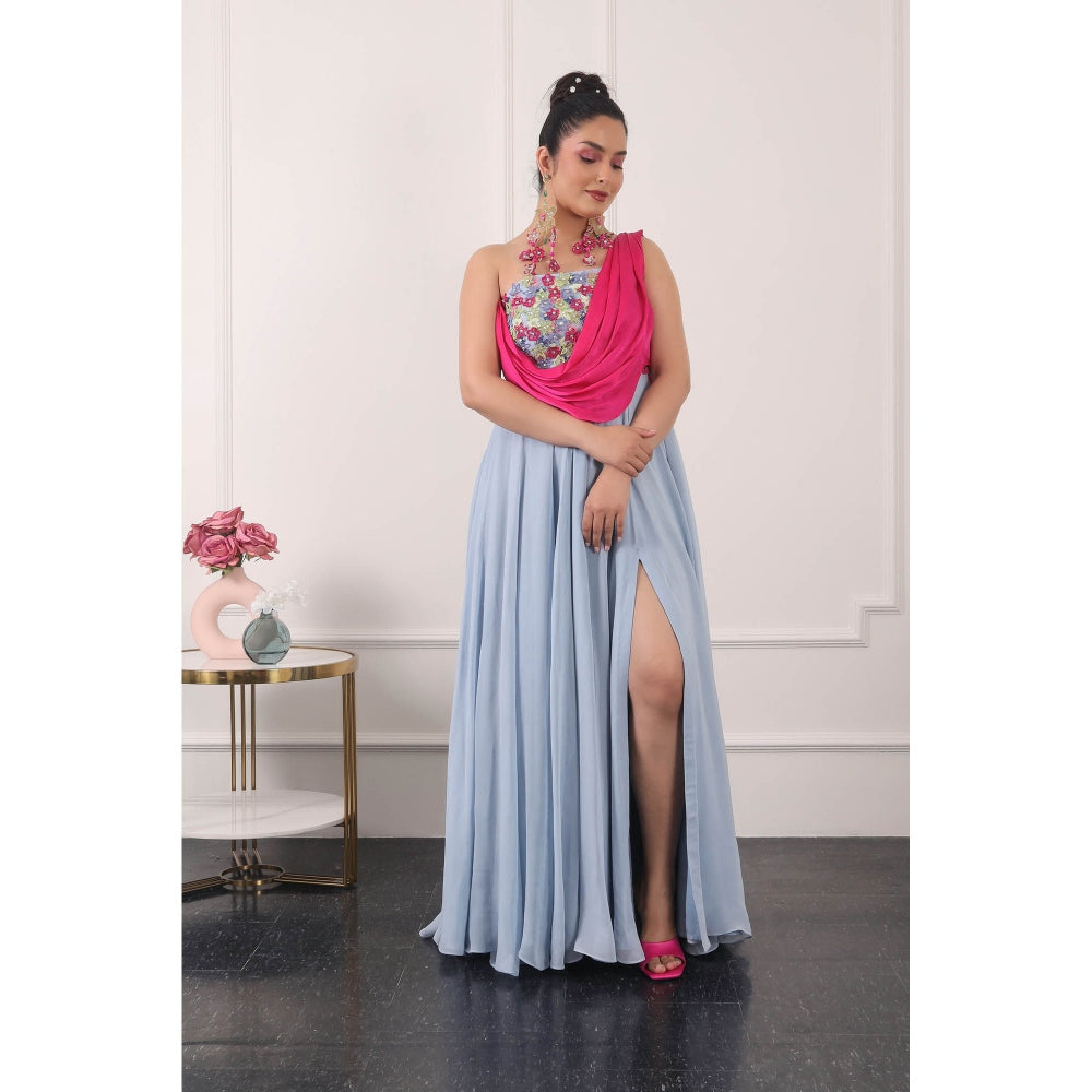 Description : Dress with Colour Block Drapes and 3D Floral Embroidery On Bodice.