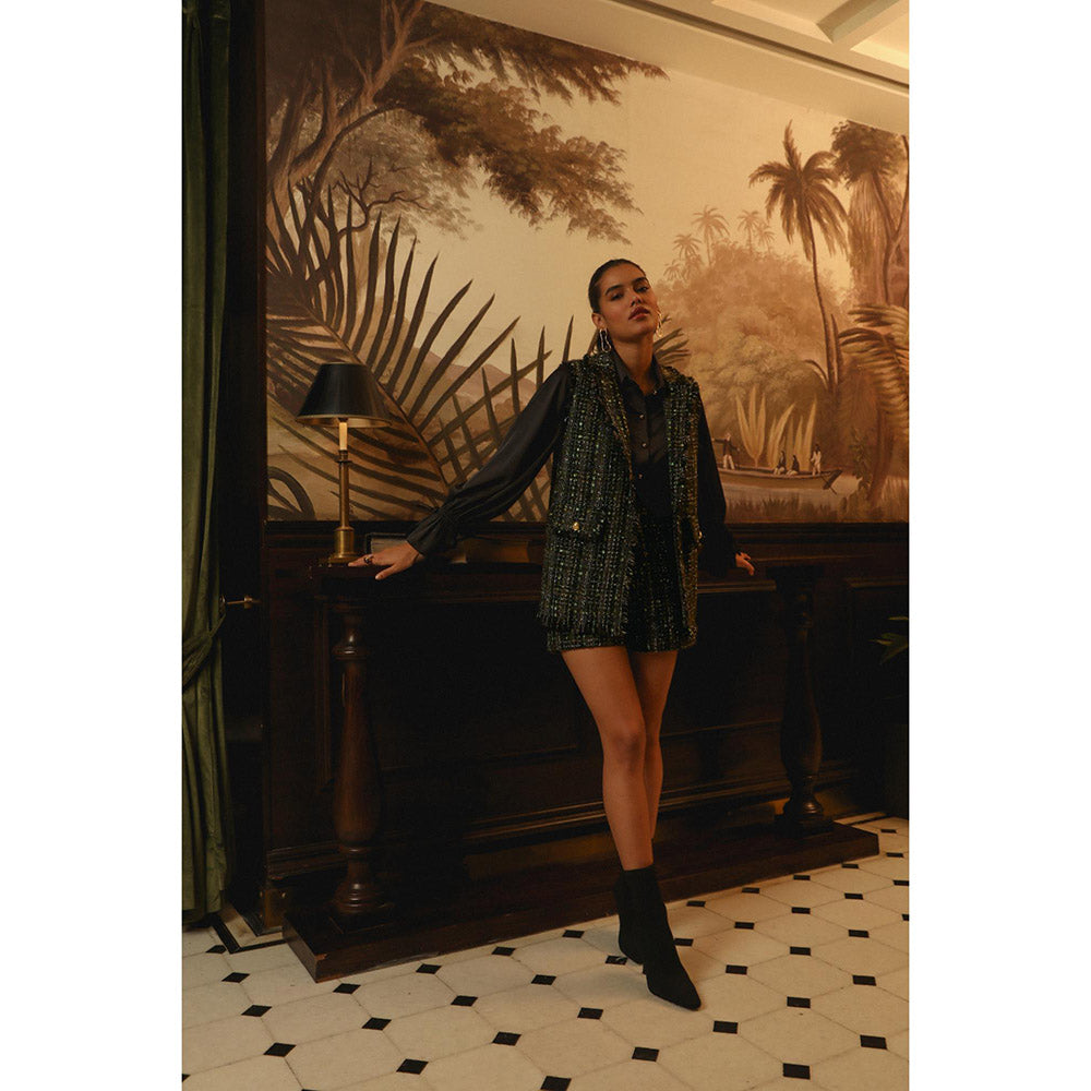 Description : Jacket :Tweed Sleeveless Gilet Front Open Frayed Edges Details Relaxed Fit Lapel Collar Shorts: A-Line Tweed Shorts Elasticated Waistband At The Backside Zipper Opening Taffeta Shirt :Fit : Relaxed Red Organza Shirt Button Down Frill Cuff With Ties Shirt Collar
