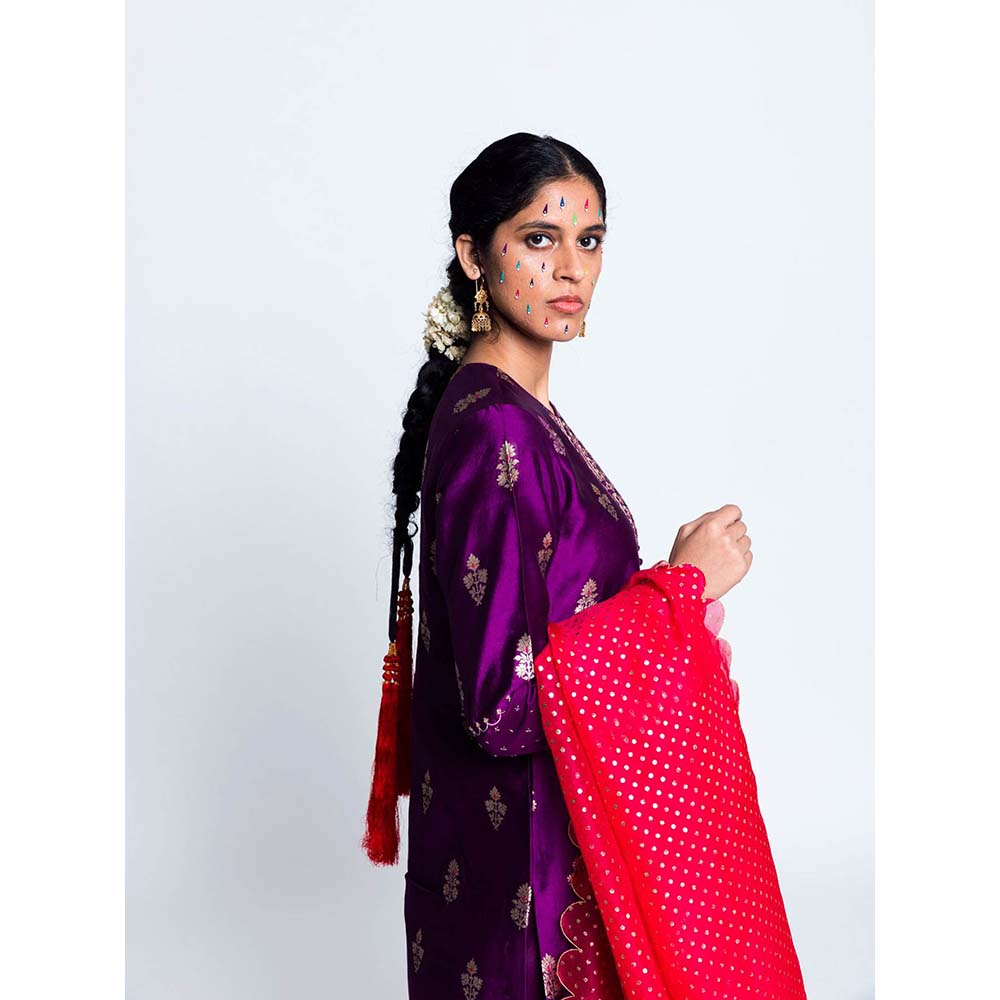 Label Earthen Women Purple Woven Kurta with Churidar & Dupatta (Set of 3)