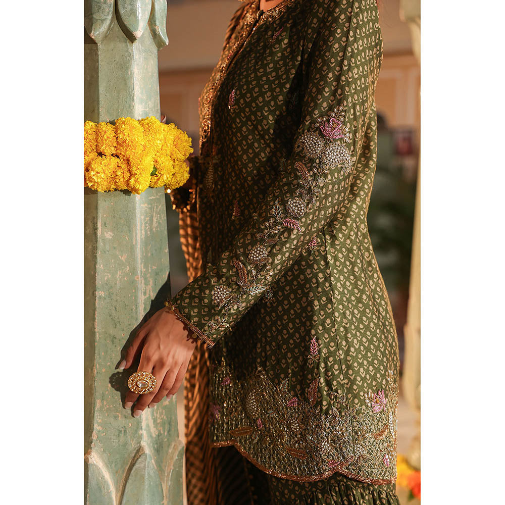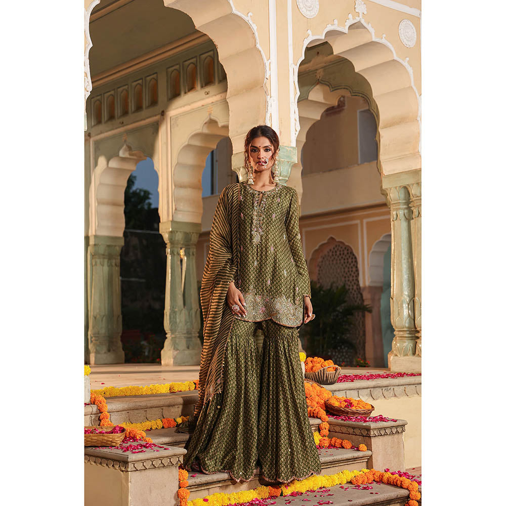 Label Niti Bothra Green Riwayat Printed Embroidered Kurti with Sharara and Dupatta (Set of 3)