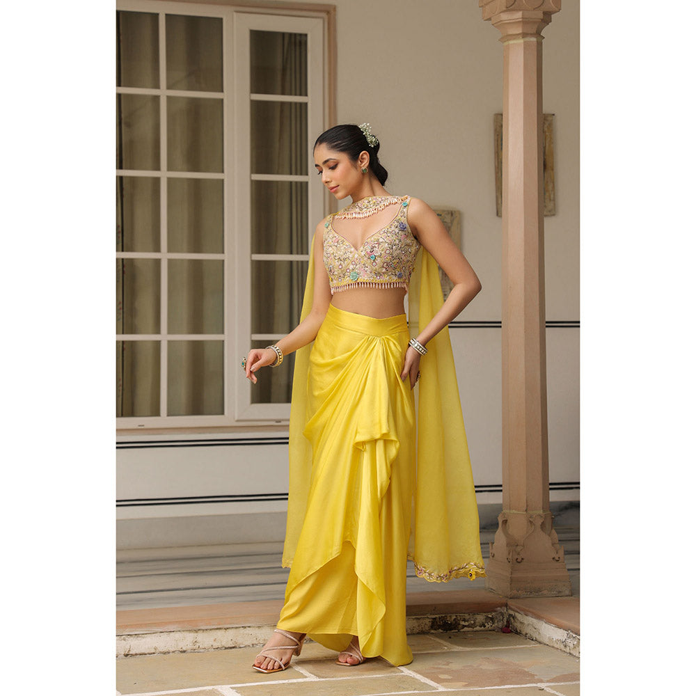 Description : This 3 Piece Skirt Set Comes with A Heavy Cutdana, Beads and Threadwork Embroidered Blouse Enhanced with Handmade 3D Flowers and Pearl Hangings At The Hem. It Is Paired with A Draped Skirt and Choker Style Dupatta Enhanced with Cutdana, Beads and Threadwork Embroidery with Pearls Hangings.