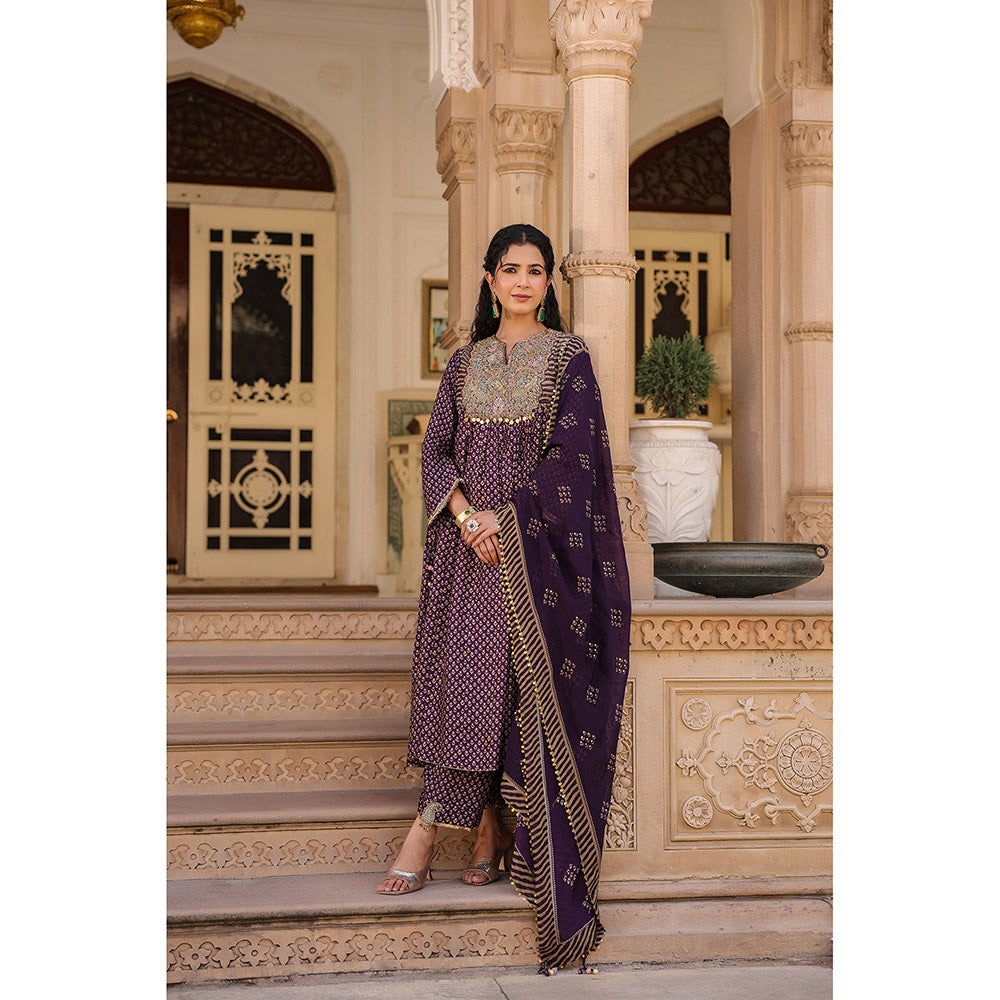 Label Niti Bothra Purple Riwayat Printed Embroidered Kurta with Pant and Dupatta (Set of 3)