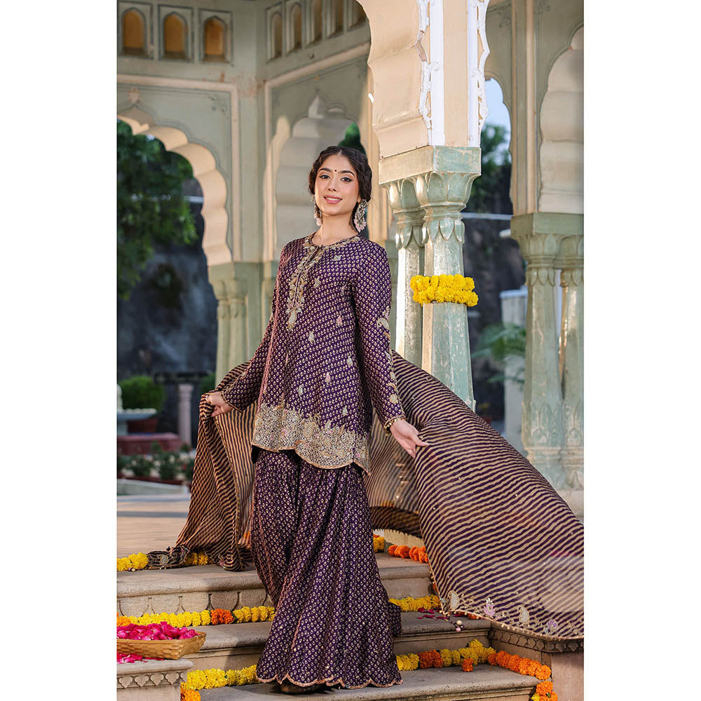 Label Niti Bothra Purple Riwayat Printed Embroidered Kurti with Sharara and Dupatta (Set of 3)