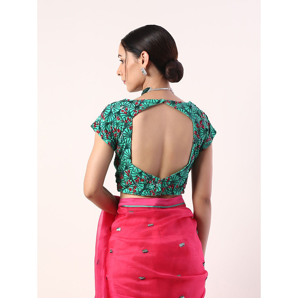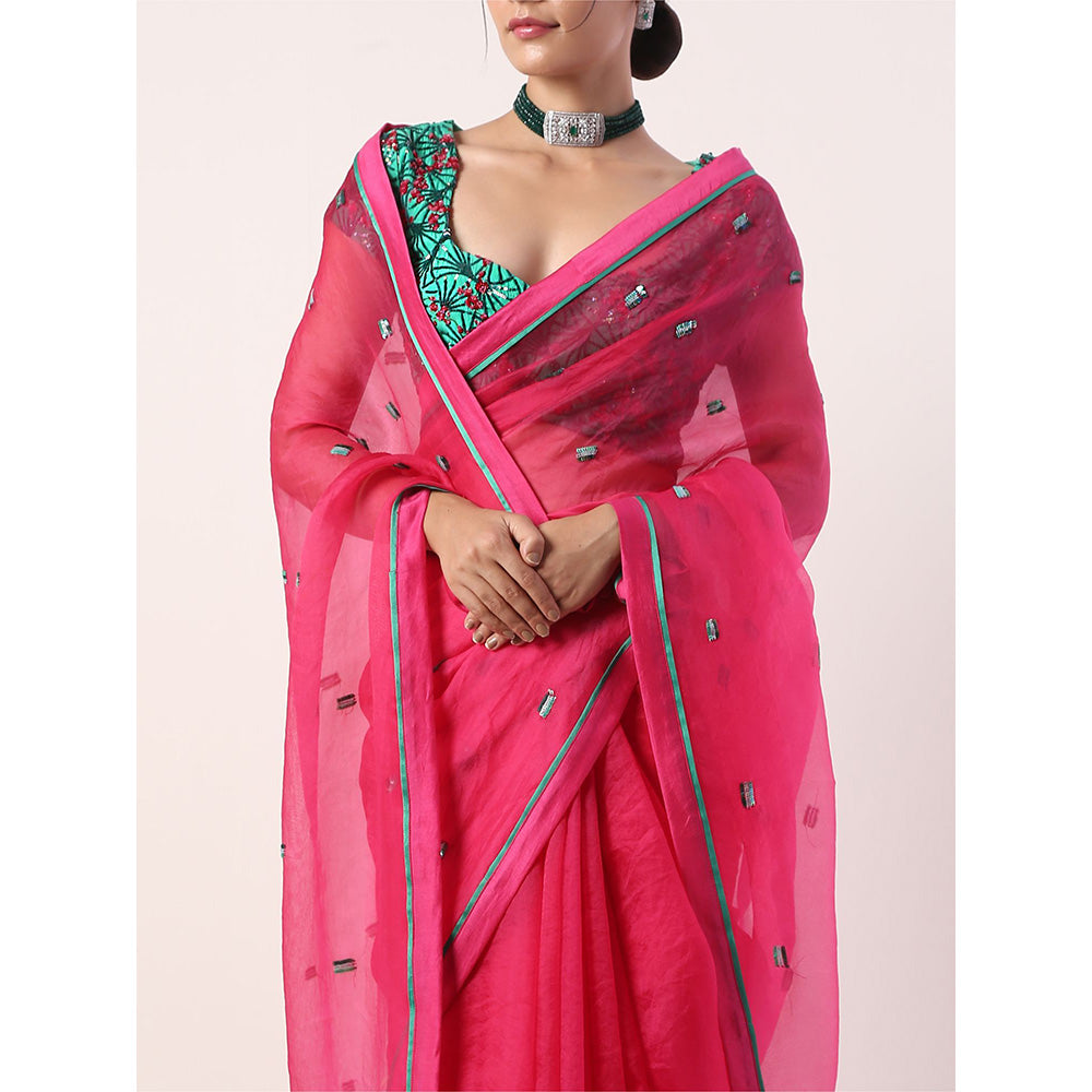 Description : Our custom 'Sakura' print is thoroughly inspired by the overwhelming beauty of the elusive pink flower on the Japanese geometrical patterns bringing together the Japanese and Indian culture.Featuring a fuschia pink embroidered silk organza saree.It comes with a green embroidered blouse.
