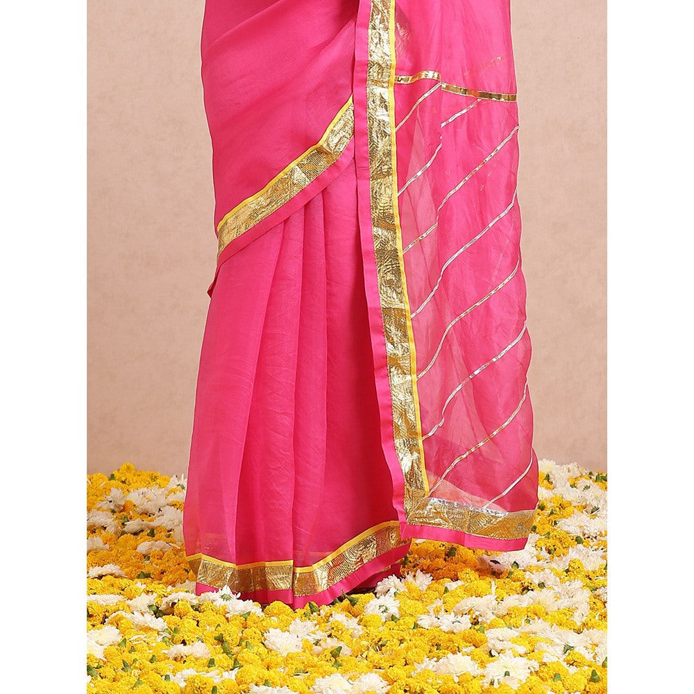 Description : Featuring a fuschia silk organza saree with gota placements all over. It is paired with a fuschia chanderi blouse having gota and hand embroidery.