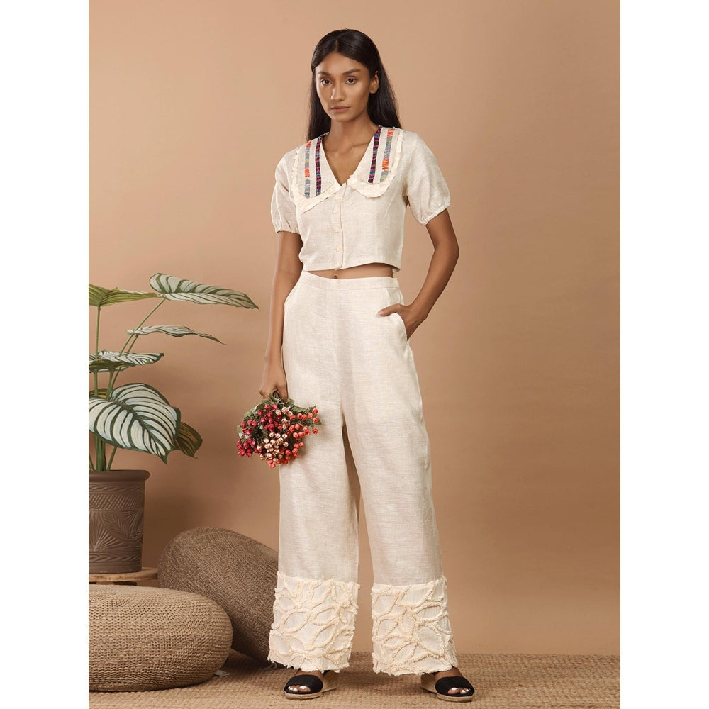 Description : Peter Pan collar style co-ord set with floral handmade buttons. The hem of pants have fabric texturing for an alluring look.