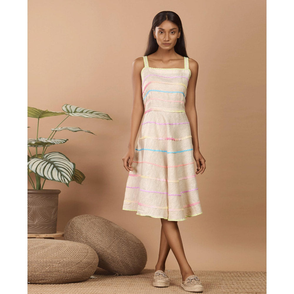Description : Lend an effortless appeal to your style with this beige dress from LABEL NIYAMI. Made from high quality linen, it features pull on closure and embroidered pattern along with sleeveless & square neck design. Pair it with heels to complete your ensemble.