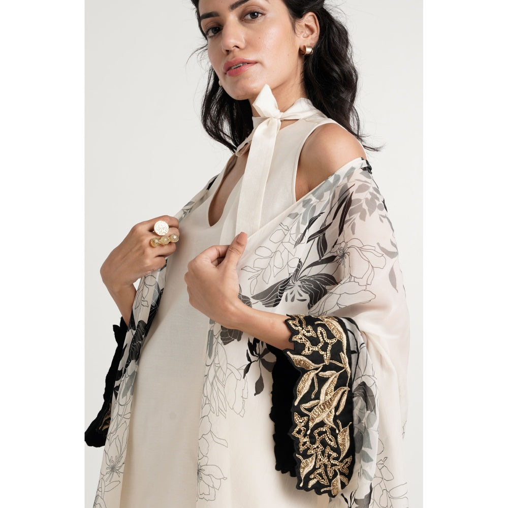 Description : Step into the world of effortless style with this ivory co-ord set from Madder Much. Made from high-quality fabric, the top features full sleeves, a tie up neck and a solid pattern, finished with a mid-waisted pant and a chic shrug. Style it with minimal jewellery and sandals to complete the ensemble.