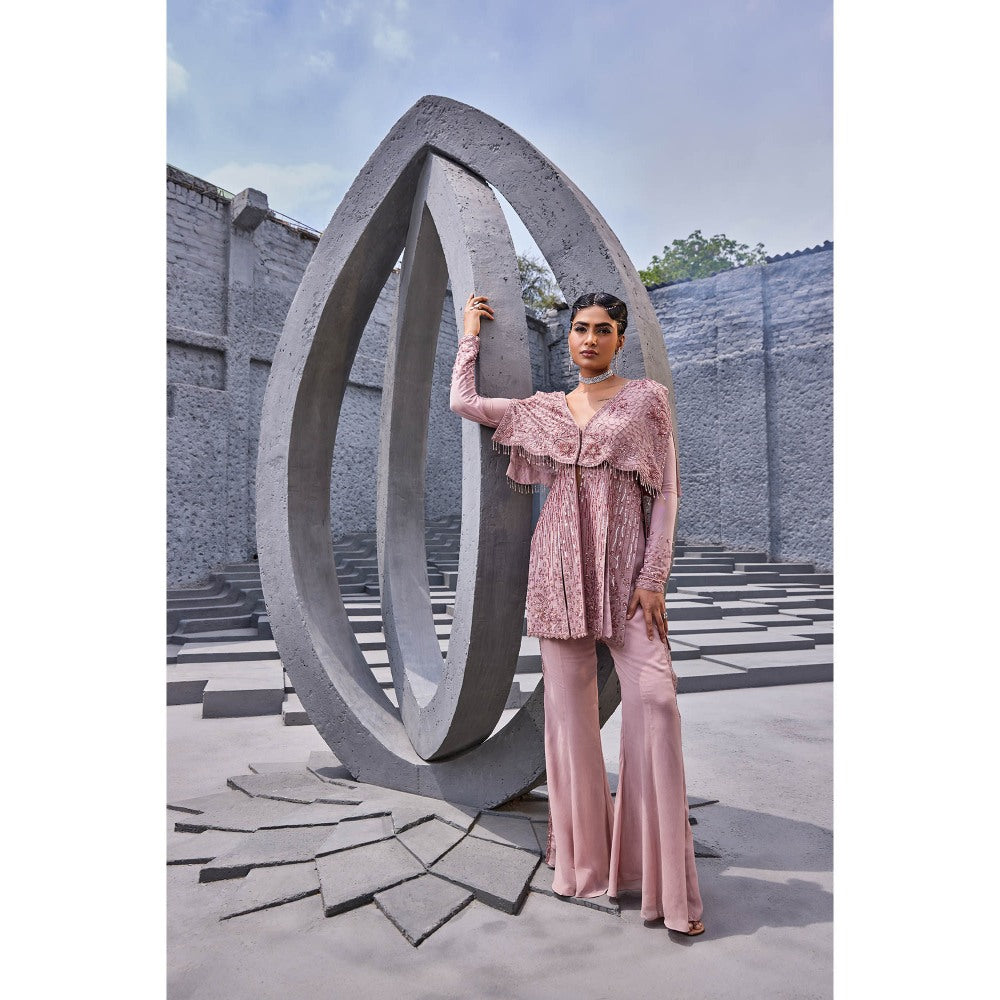 Description : This Pink Front Open Jacket Which Is Entire Hand Embellished Has A Over Jacket Attached To It Which Gives A Look Of Cape Over It. The Sharara Has Side Slits Giving The Proper Retro Look To The Attire with Embroidery Over The Sides Of It.