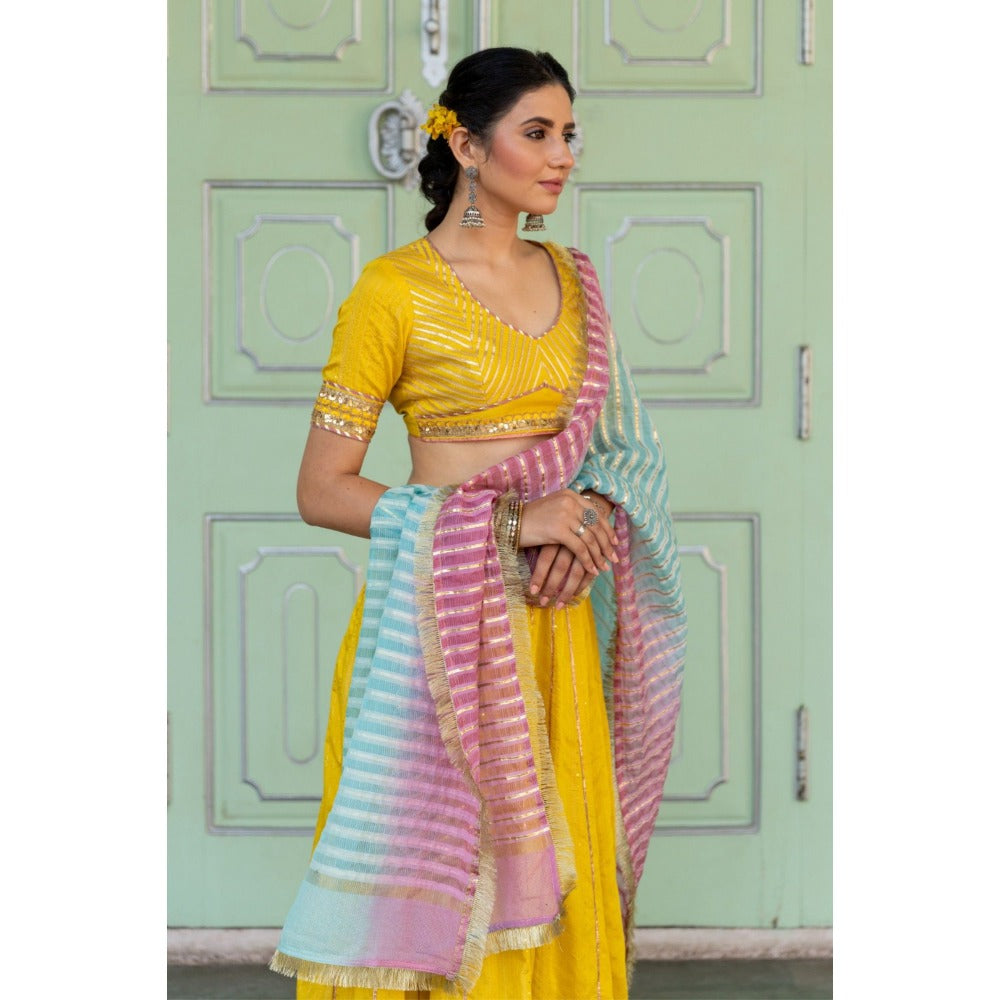 Description : A beautiful yellow festive lehenga set in Chanderi blend with intriguing color play and beautiful sequin details. It features an embroidered tie-up blouse and unique ombre gota dupatta. Statement Lehenga-set to have !