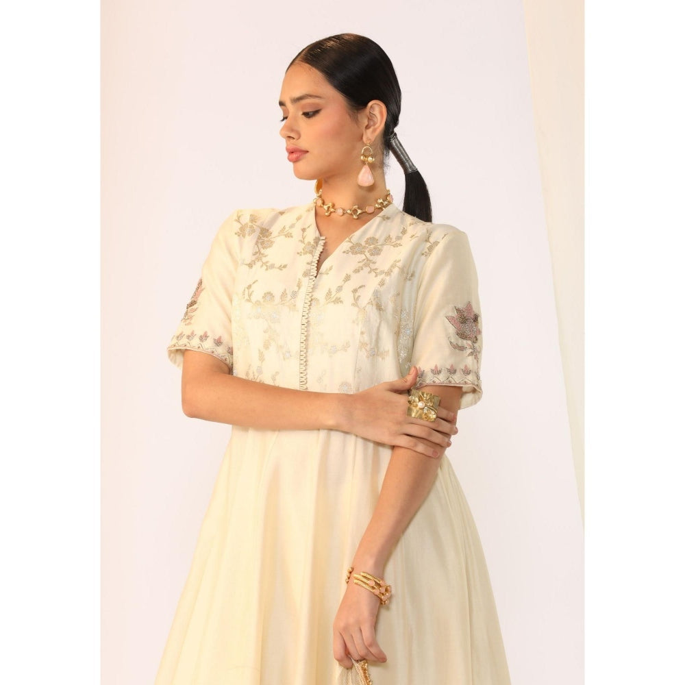 Description : Elevate your style with this white Anarkali set from Myoho. Crafted from chanderi, this beautiful set is finished with half sleeves and a V-neck. Team it with a pair of heels and chic earrings.