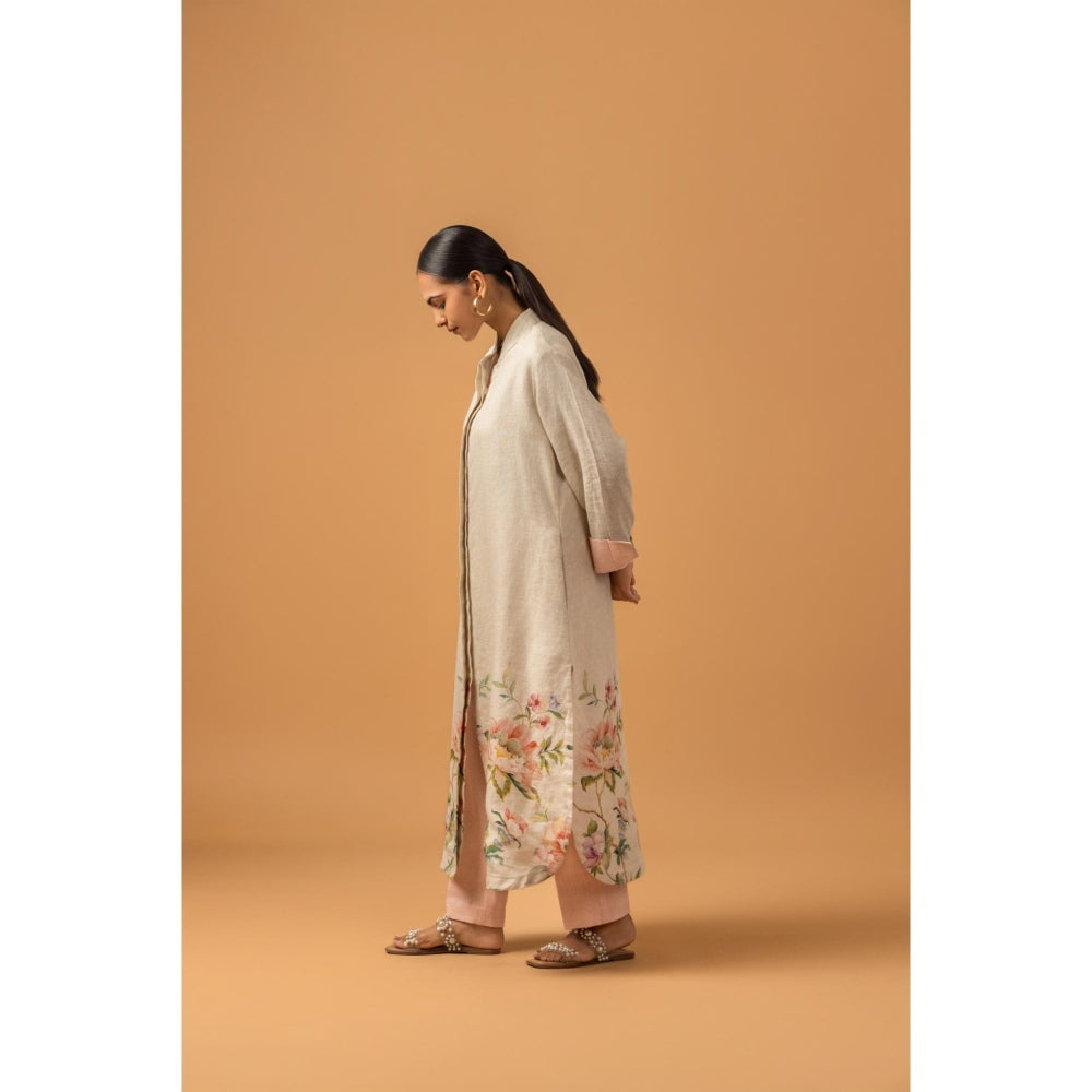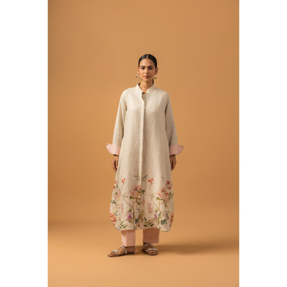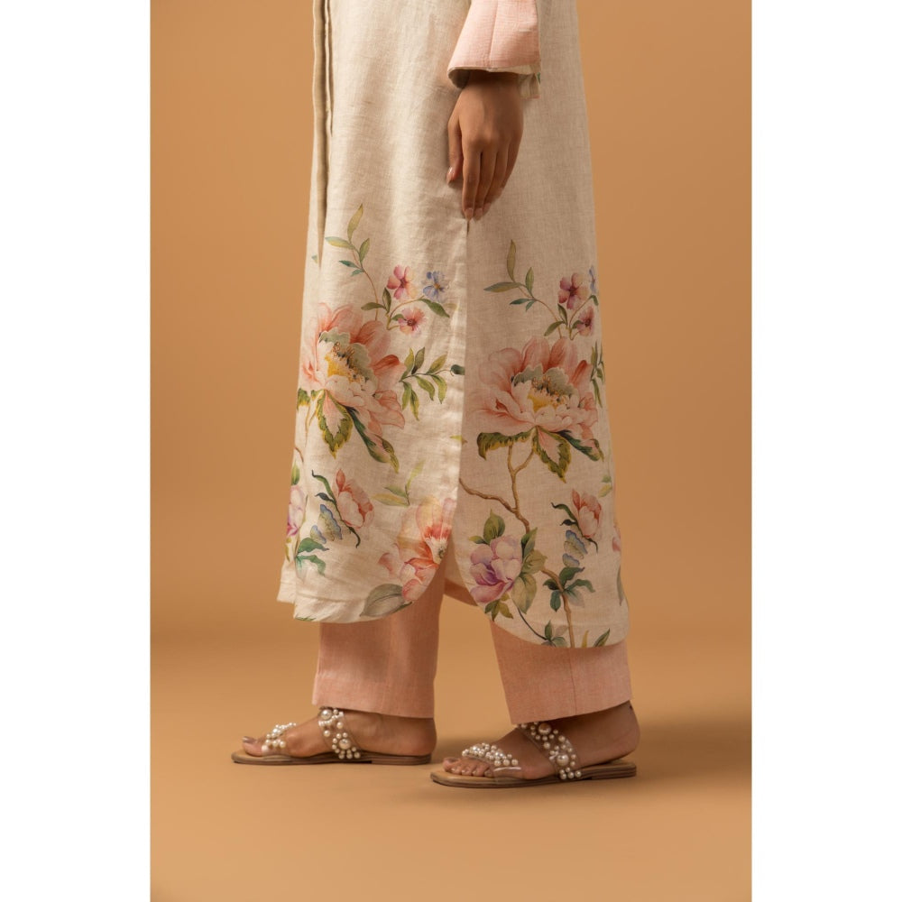 Pearl Floral Trail Linen Premium Kurta with Pant - Beige