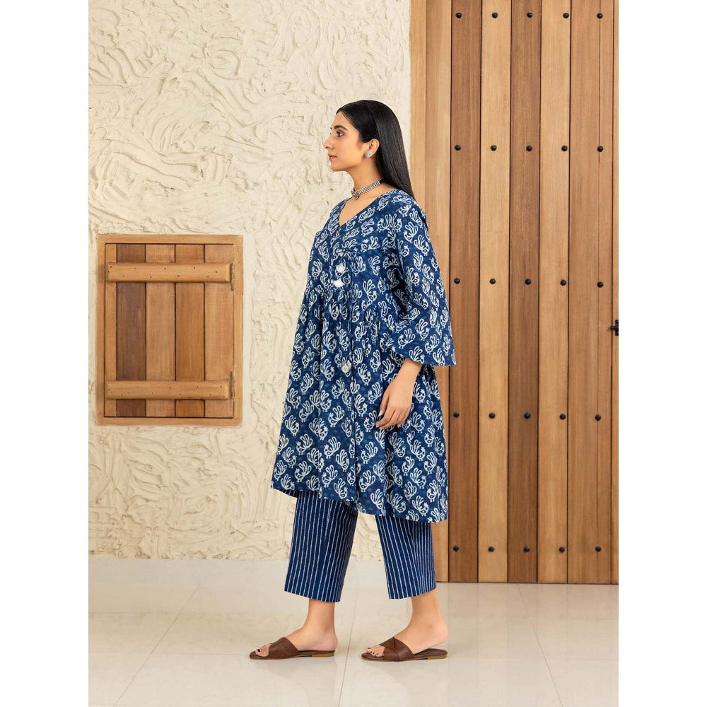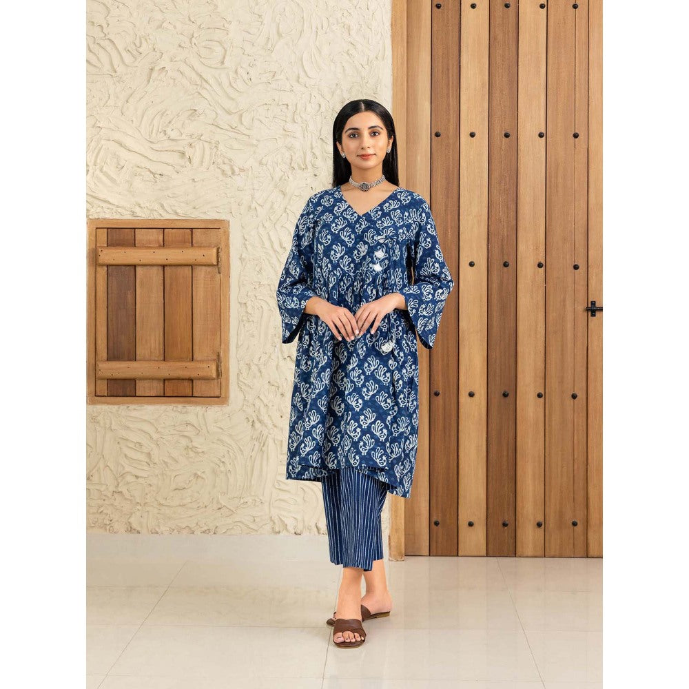 Description : Our Naseebo Serenity Bloom Blue Kurta Set Is A Celebration Of The Rich Heritage Of Indigo Dyeing, Thoughtfully Crafted From 100% Organic Cotton. The Kurta with A V-Neck and Elegant Bell Sleeves, Features Exquisite Block-Printed Patterns On A Rich Blue Base. Paired with Striped Bottoms, This Ensemble Is A Harmonious Blend Of Heritage and Modern Sophistication. Ideal for The Woman Who Values Style and Heritage, This Set Is Perfect for Workdays or Effortless Everyday Chic, Radiating Grace with Every Wear.