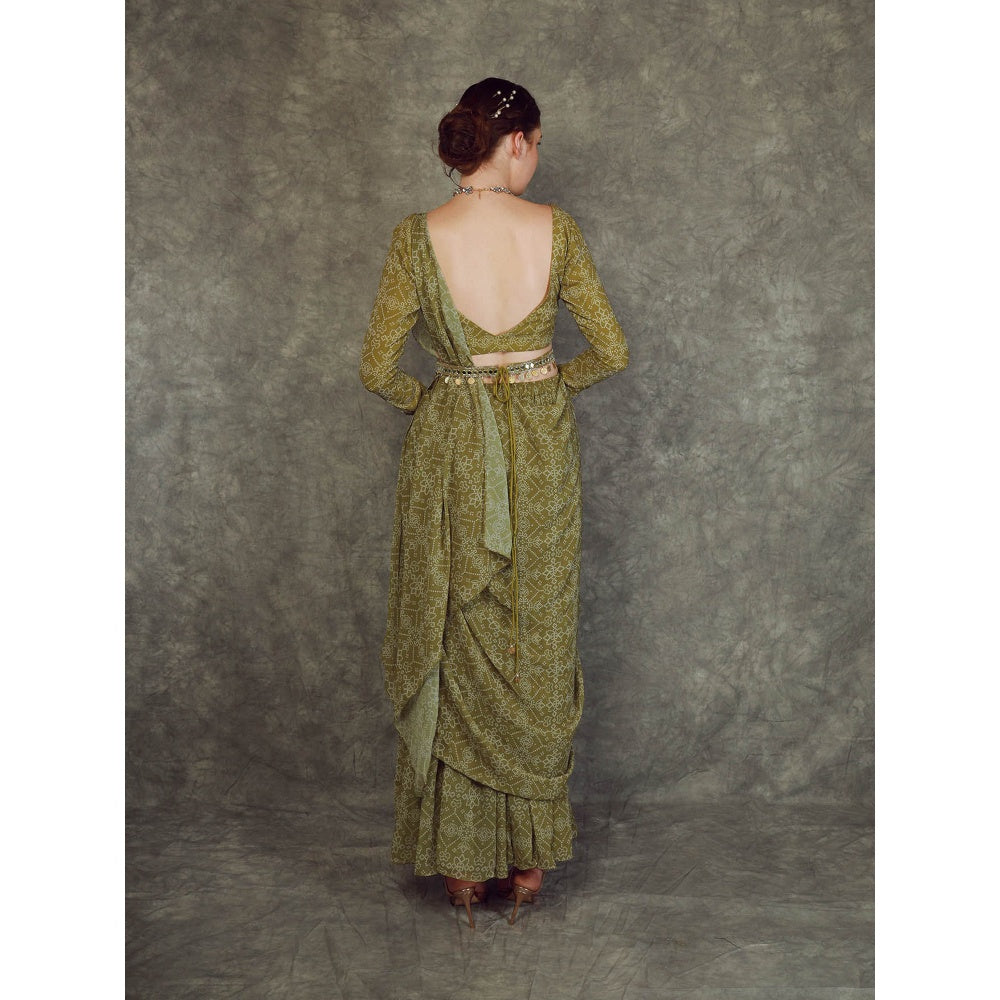 Description : OLIVE GREEN PRINTED DRAPE SHARARA SET WITH EMEBROIDERED BLOUSE