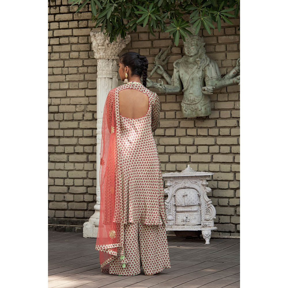 Description : Conquer the zenith of refined charm with this quirky look from Nikasha. This jade knee length poppy printed crepe kurta comes with mataka neck at back paired with poppy printed sharara styles with gajri mukesh net dupatta. Style this look with brown juttis, heavy chanbalis and a matching clutch.