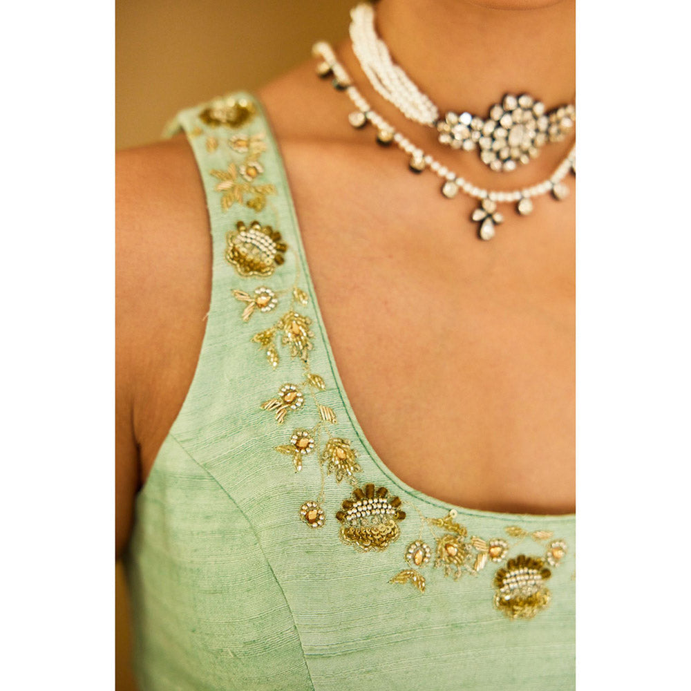Description : Mint foil pure silk chiffon saree with embroidered palla paired with mint pure raw silk dabka and sequins zardosi embroidered sleeveless blouse