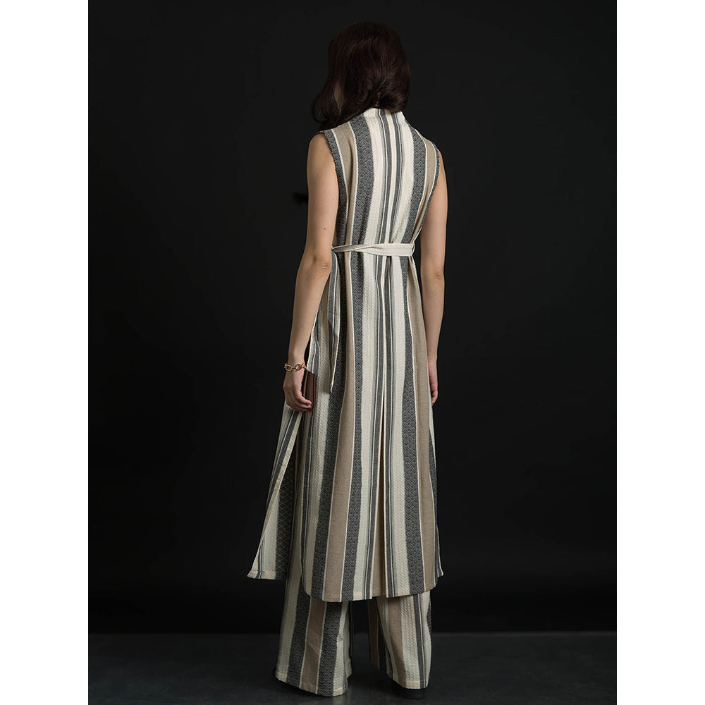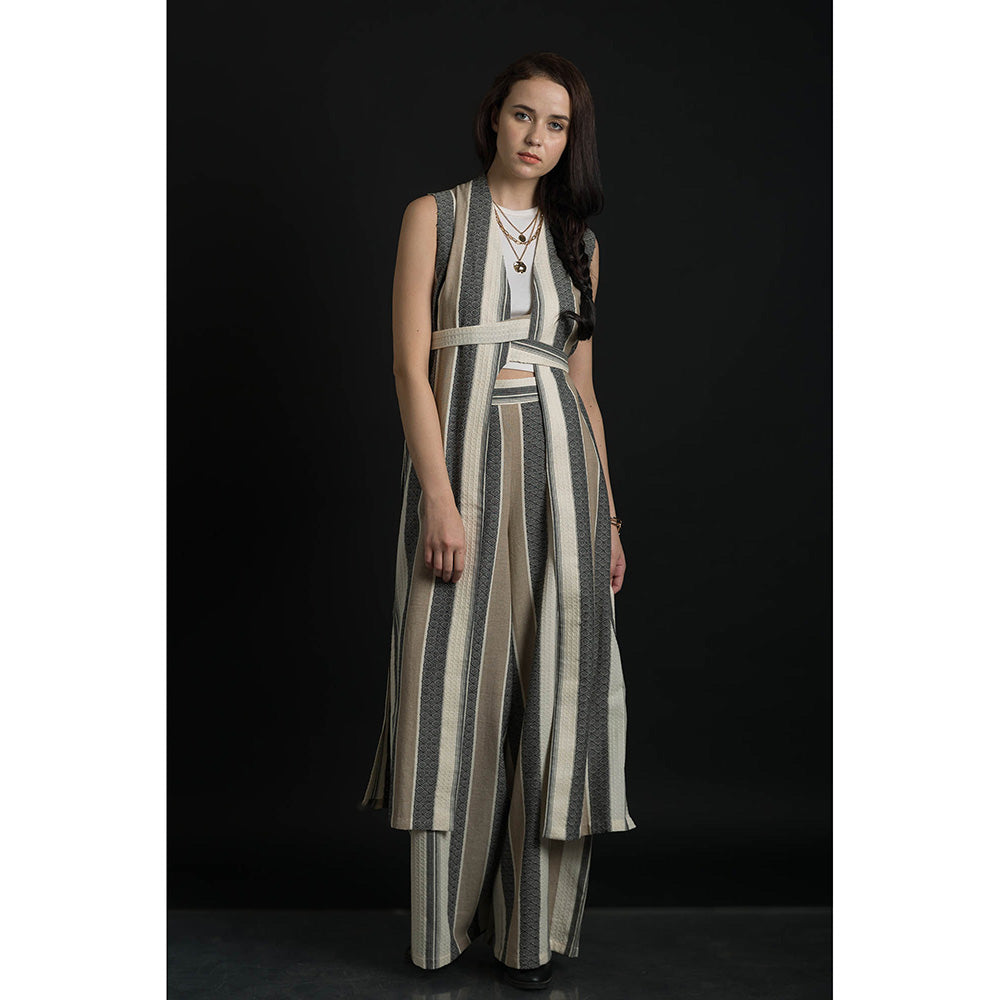ORCR Parayan Stripes Sleeveless Beige Jacket with Pant (Set of 3)