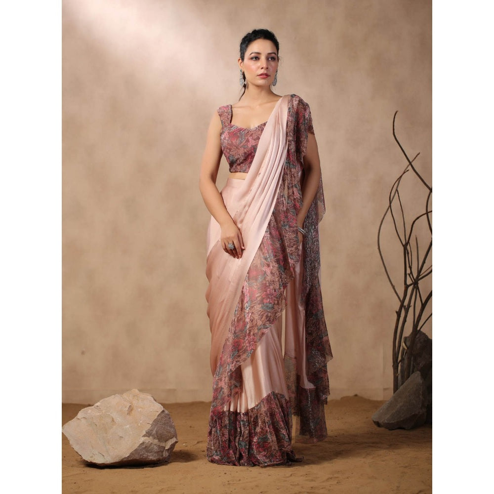 Pink Printed Ruffles Pre Draped Saree with Stitched Blouse