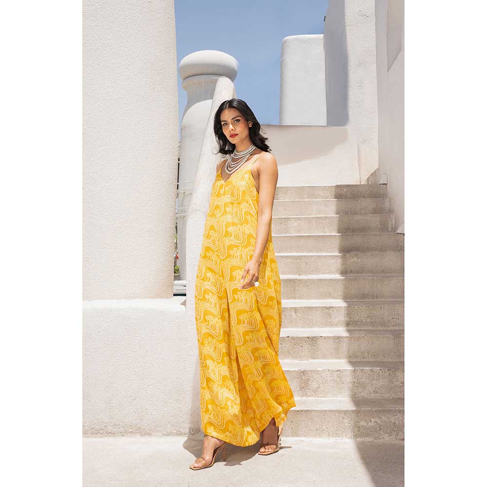 Description : Add A Touch Of Elegance To Your Wardrobe With This Yellow Jumpsuit From Pallavi Jaipur. Made From High-Quality Blended Fabric. It Features Floral Pattern With Sleeveless, Shoulder Straps Style. Style It With Jewelry And Flats To Complete The Ensemble.
