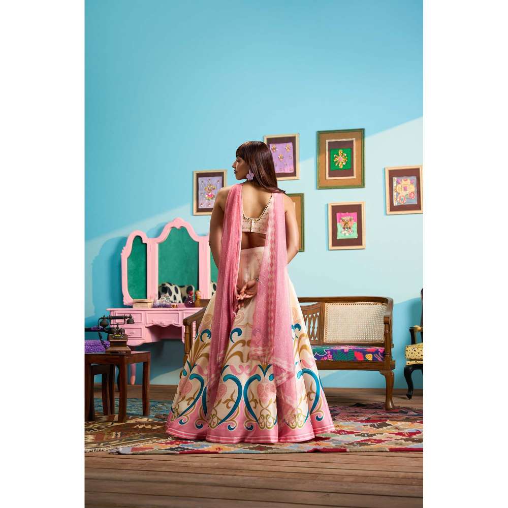 Description : Embrace your style with this pink lehenga set from Papa Don't Preach by Shubhika. Made from high quality raw silk, it features hook and eye closure and printed pattern along with sleeveless & plunging neck design. Pair it with minimal jewellery and a handbag to complete your ensemble.