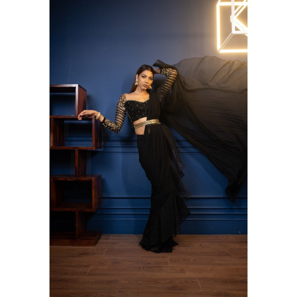 Night Tulip Ruffle Saree with Stitched Blouse & Belt
