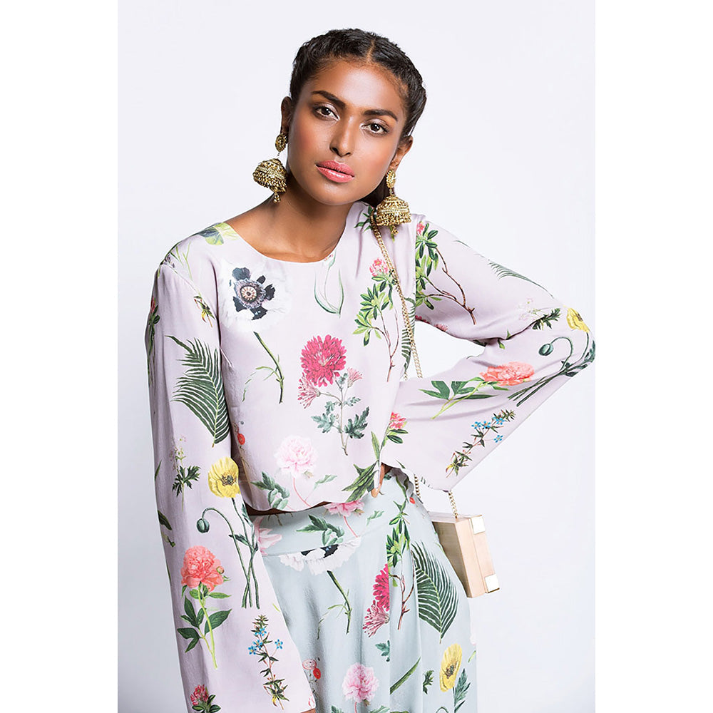 Payal Singhal Lilac Printed Crepe Crop Top & Aqua Printed Crepe Low Crotch Pant (Set of 2)