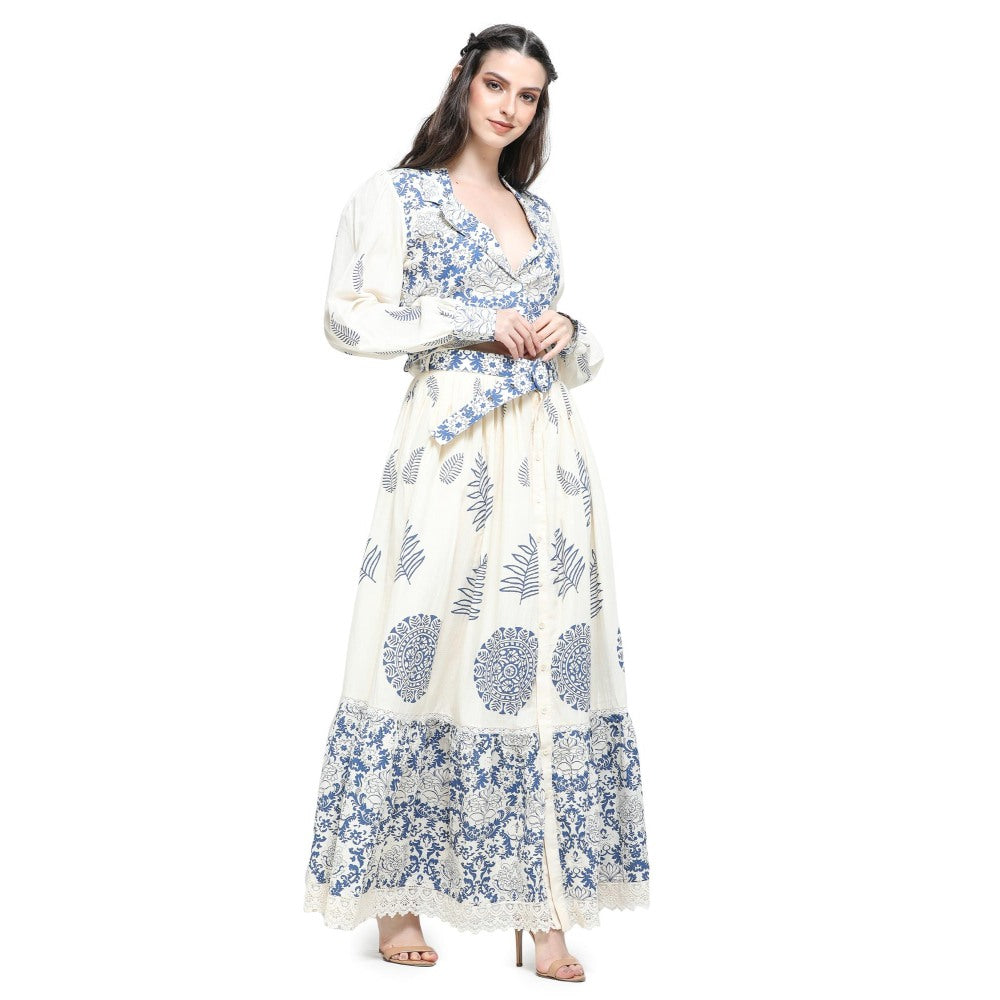 Bone Khadi Block Printed Top with Skirt (Set of 3)