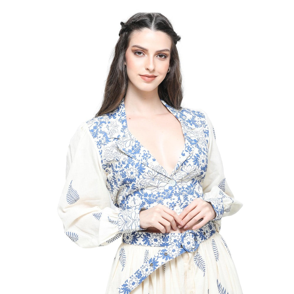 Description : Elevate your style with this white bone khadi block printed top with skirt from Pinnacle By Shruti Sancheti. Made from high-quality khadi, this piece features full sleeves and a notched lapel collar. Style it with minimal jewellery and sandals to complete the ensemble.