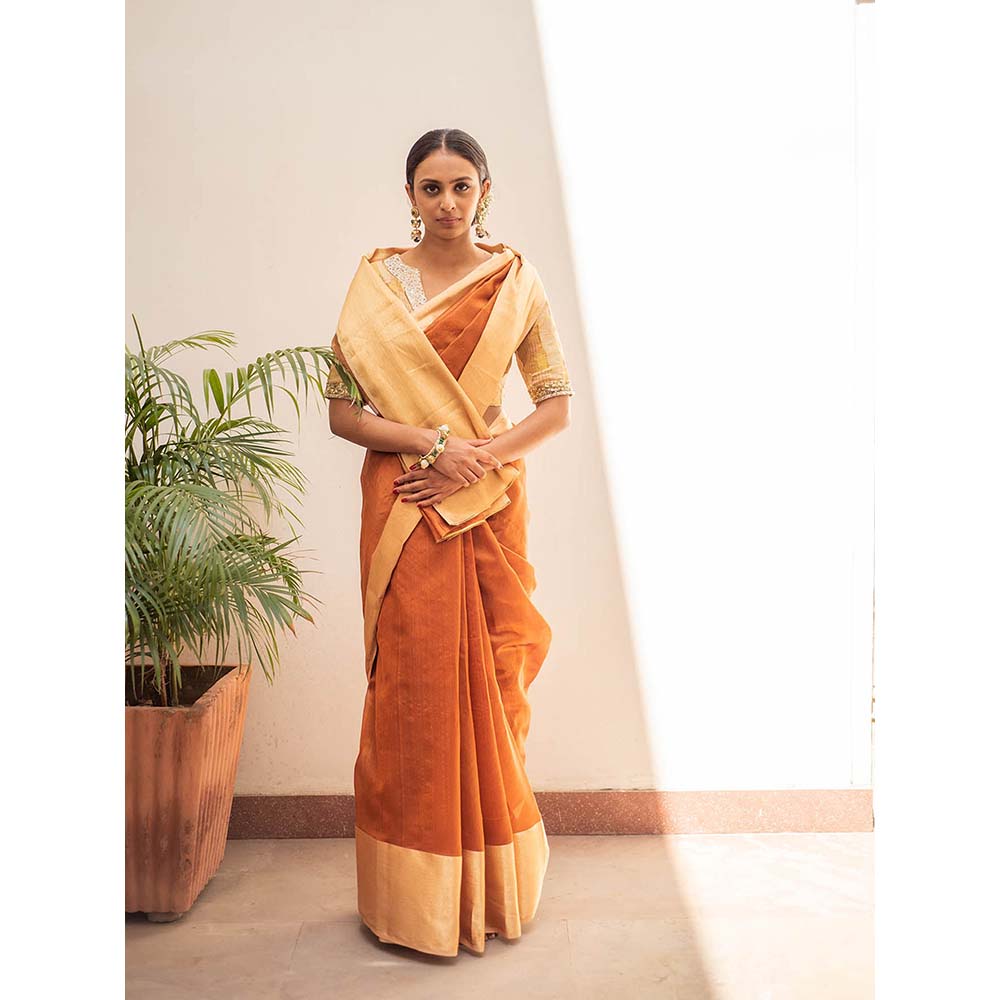 PRIYANKA RAAJIV Lopa Rust : Rust and Gold Plain Silk Chanderi Saree with Unstitched Blouse