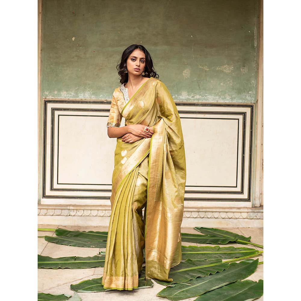 PRIYANKA RAAJIV Rena Green - Olive Green Silk Banarasi Saree with Unstitched Blouse
