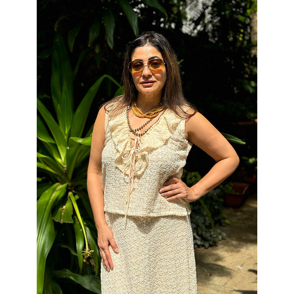 Description : Sleeveless Double-Ruffle Top And Midi Skirt Set - Cream, Cotton Linen, Self-Embroidered Cream Flowers, V-Neck with Tie-Up Straps, Elastic Waist Skirt.