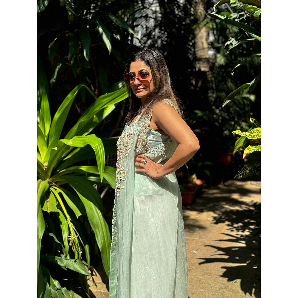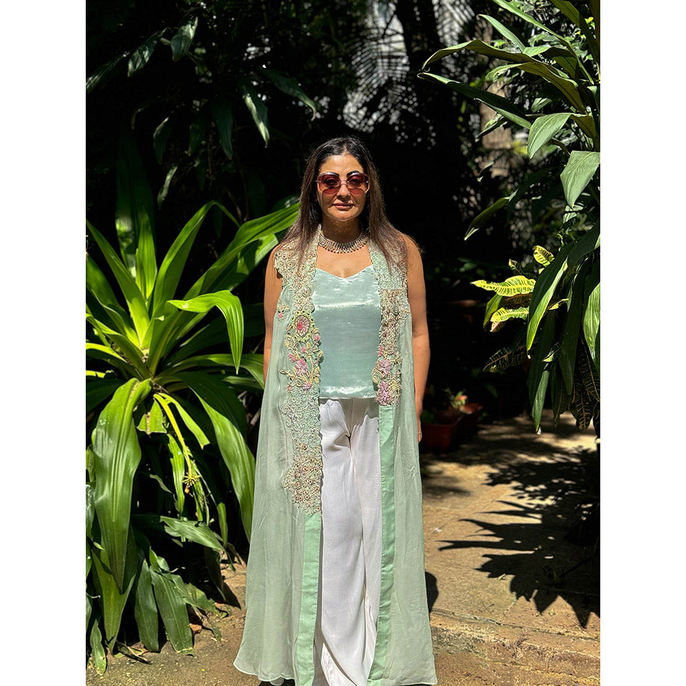 Description : Sleeveless Maxi Cape And Top - Aqua Green, Organza, Hand-Embroidered Flowers
